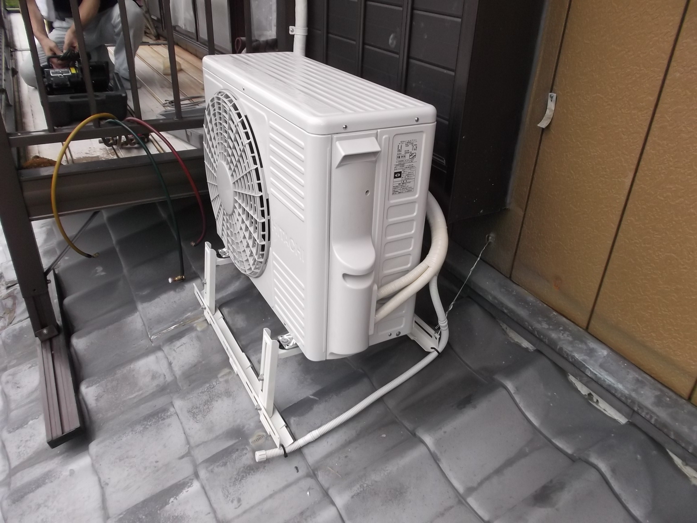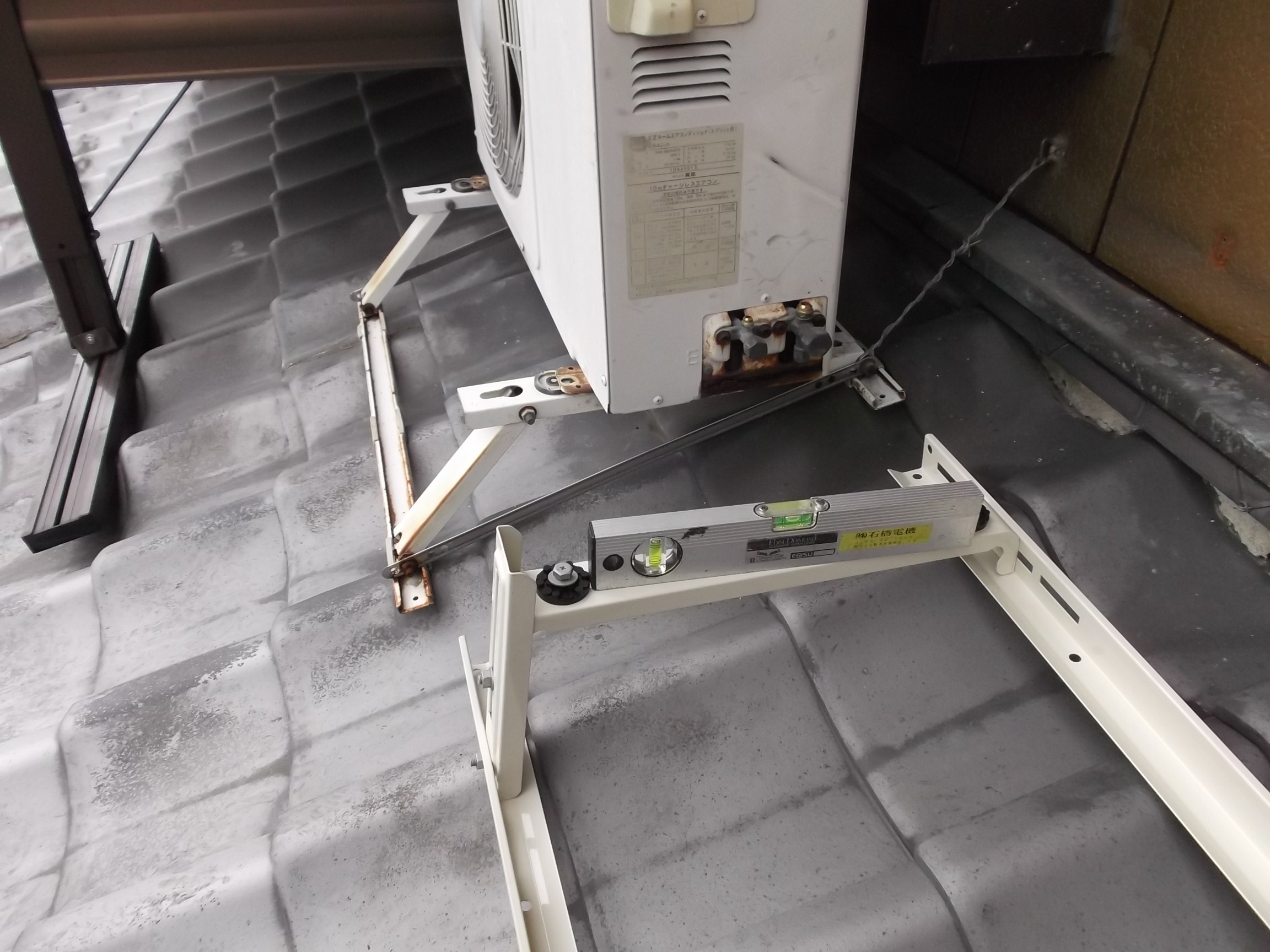エアコンの交換工事です。 既存品も屋根に置き、新しい室外機も同じように設置します。 この時必ず必要なのが『屋根置台』(傾斜屋根用の設置台)です。稀にですがこれを使用しないで、傾斜側に木材やブロックなどを挟み込んで、水平設置の様に見せかけたのを見た事あります、、、。屋根の傾斜が緩かったりすると、やっちゃうみたい、、、。