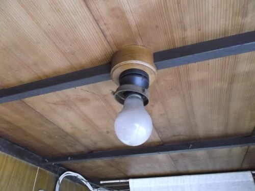 内玄関の上の照明器具です。昭和20年代や30年代生まれの方は、見覚えのある写真でしょう、、、。 竿打ち天井に木質の台座、そして昔の「レセップ」に裸電球、、、。 まさしく!!! 『昭和の天井』 これを撤去して、LEDの器具に交換します、、、。 丸い「木台」は使いたいが、中の電線が「昔の電線」(袋打ち)(布線)心配です、、、。 今の電線「Fケーブル」なんて、」引っ張り出しても出てくる事無いし、、、。 ここはLED照明にします。 器具と、専用LEDライトで一万円と工賃三千円です。 天井裏配線が使えないと、別個に配線工事費が掛かります。(お客様には、了承済みです。 )