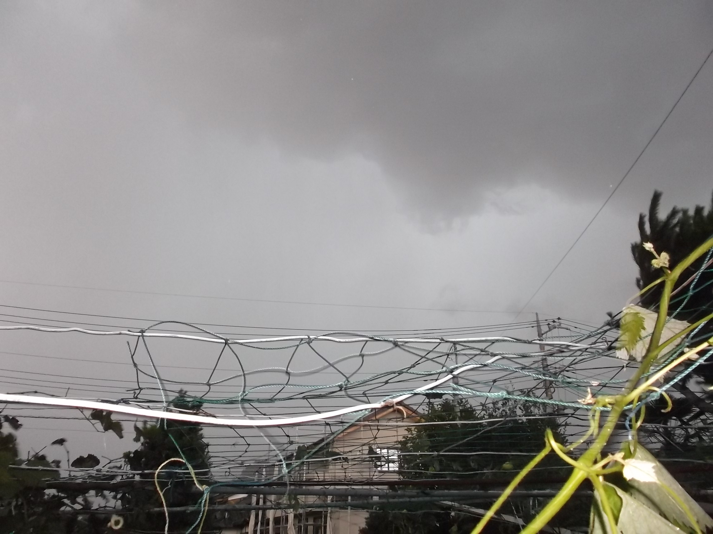 到着後5分も経たないうちに、上空の雲がグルグル回り出しているのに気付き、軽トラの部材・工具はお客様宅の玄関に「緊急避難」させて頂きました。 写真の雲の下がトンガっていて、それがグルグル回転していました、、。
