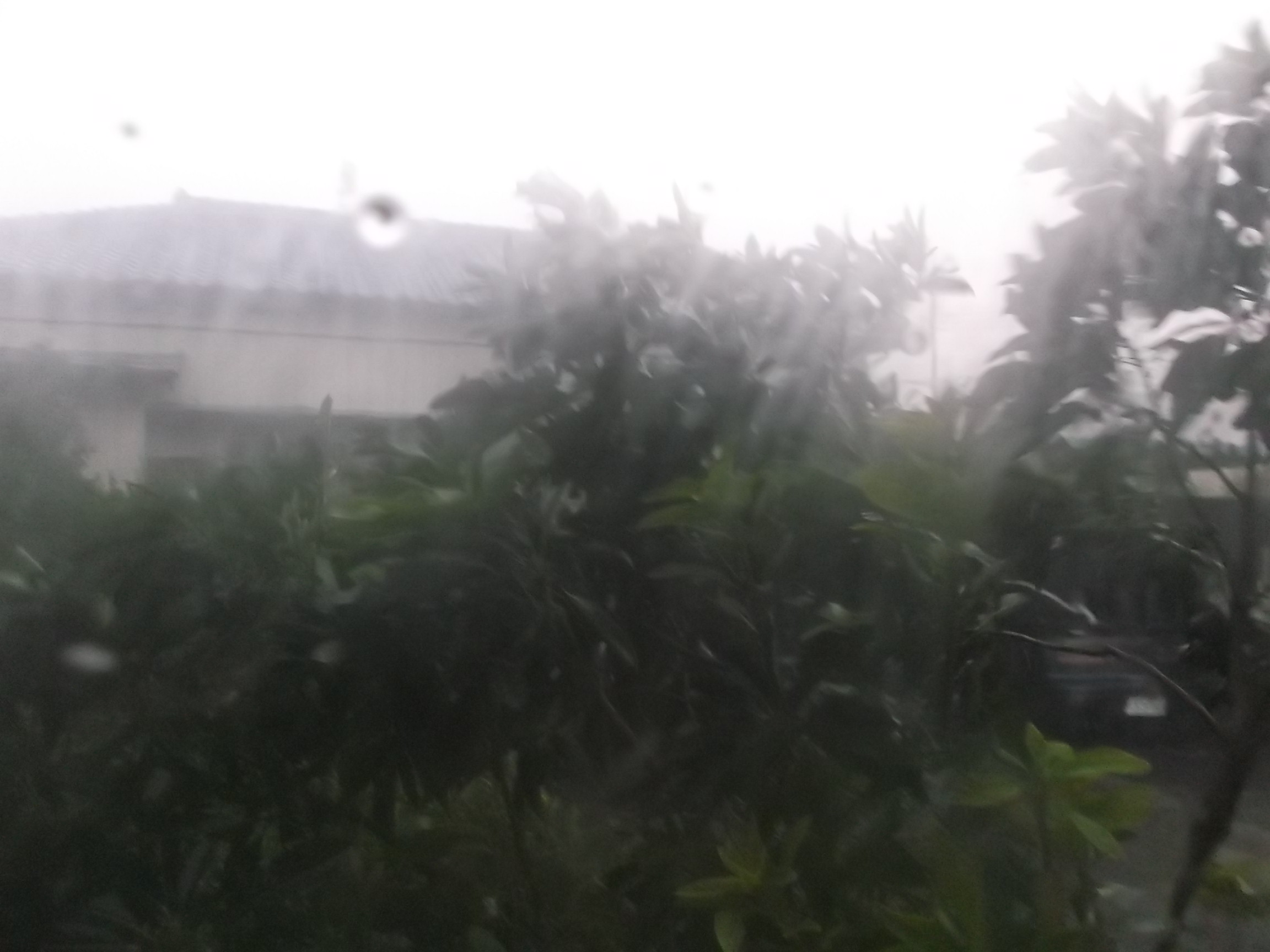 これが終わりかけの外の様子ですが、ほんの数分前には外の景色が強い雨で「真っ白」になり外を見る事は出来ませんでした、、、。 この最中に私が見た「物」は「子供用のプール」と「波板トタン」が、ホームを通過する特急電車みたいに、、、飛んで行きました、、、。