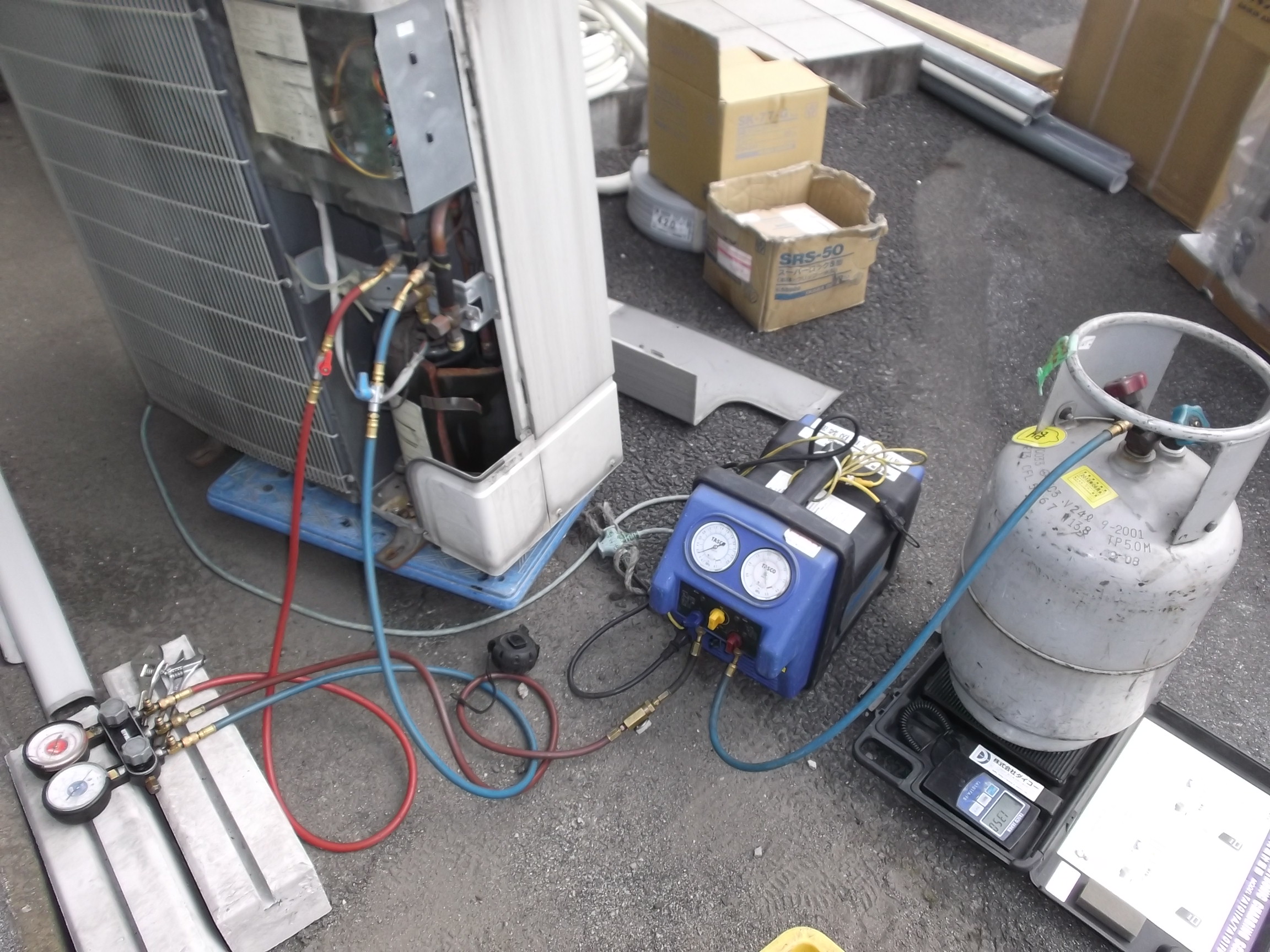 取り外した室外機からフロンガスをボンベに回収して、その後「破壊処理」の専門業者さんに渡します。