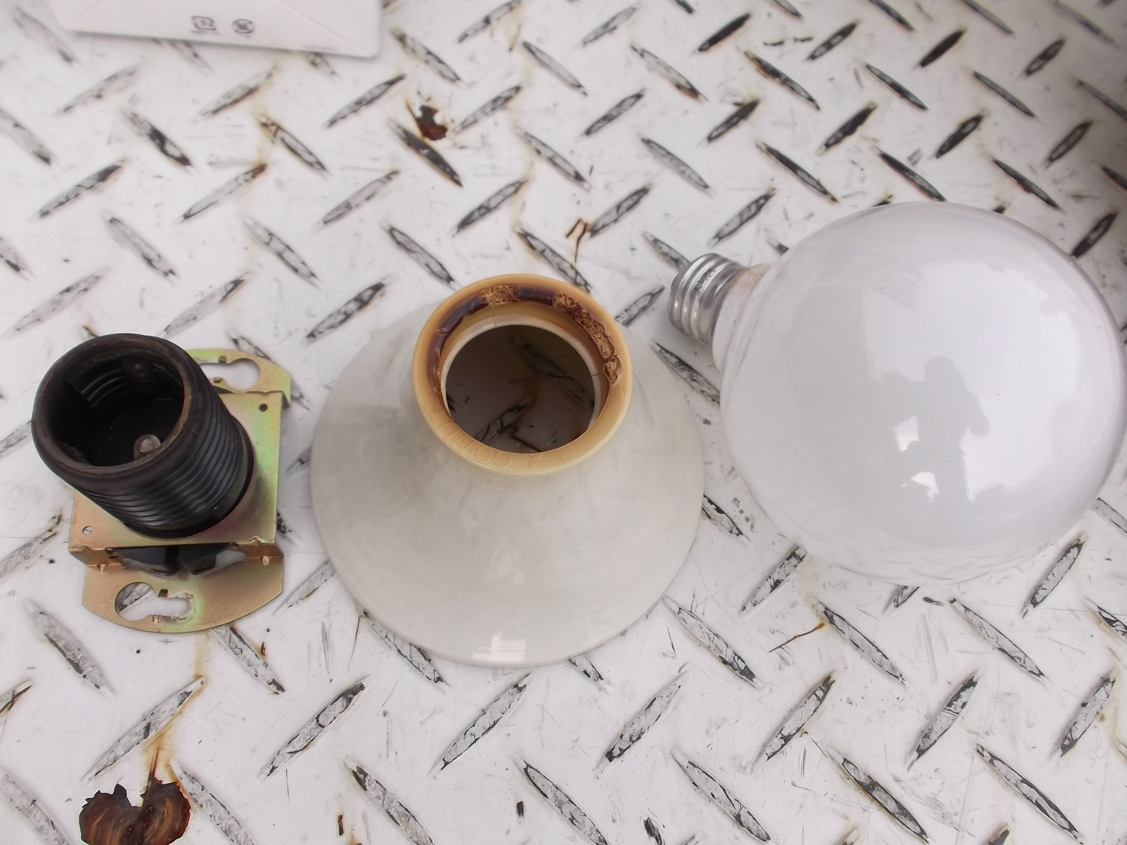 トイレ天井の照明器具の交換の依頼でお伺いです。 ソケットの部分が電球の熱で焼け焦げています。電球の形状が適切な形で無い物を付けられていましたのが、原因です。