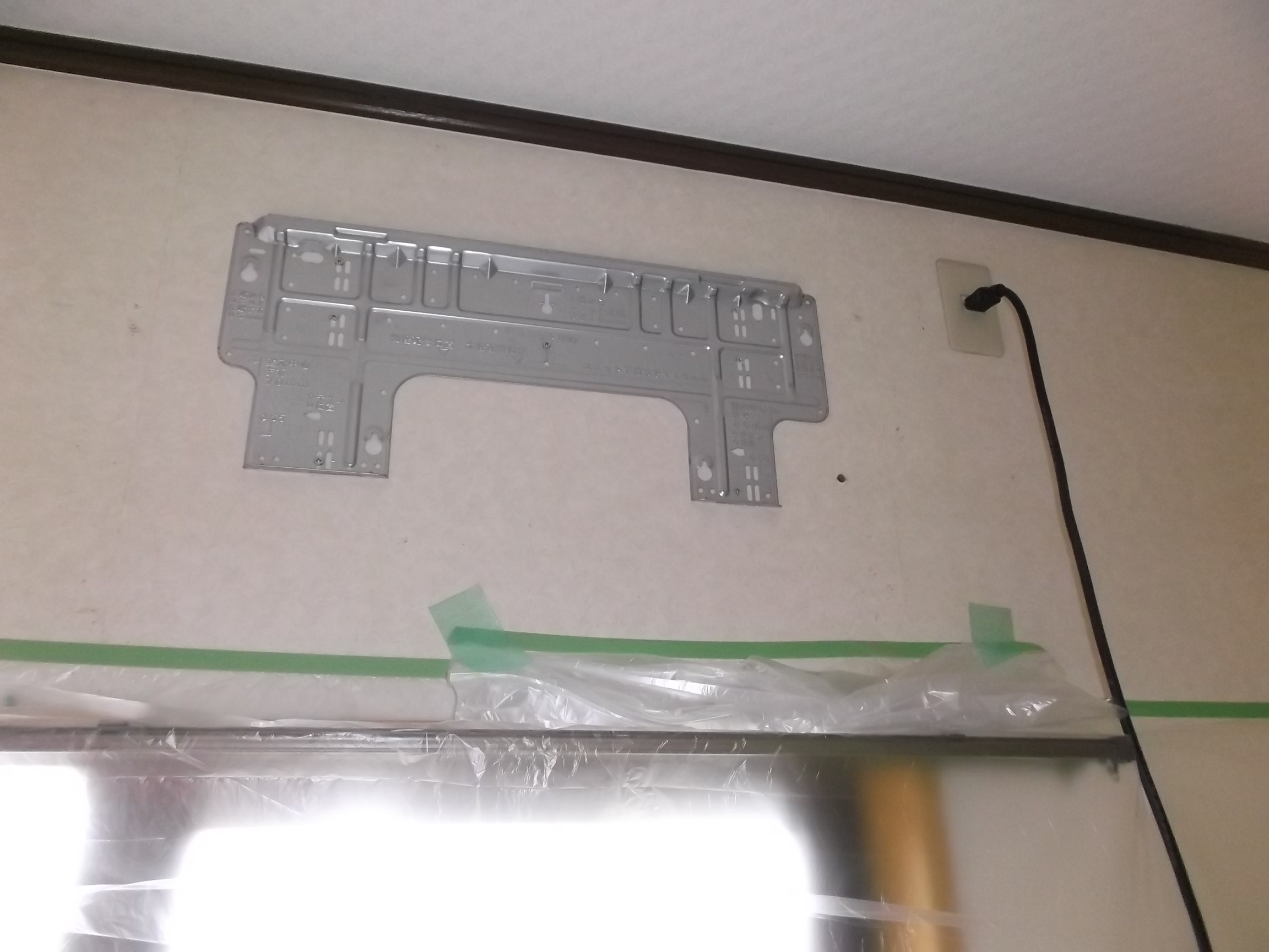 エアコン専用コンセントに、壁貫通用ドリルを使い穴を開けます。ちり・ほこりが落ちないように養生シートを壁に張り、準備万端しておきます。