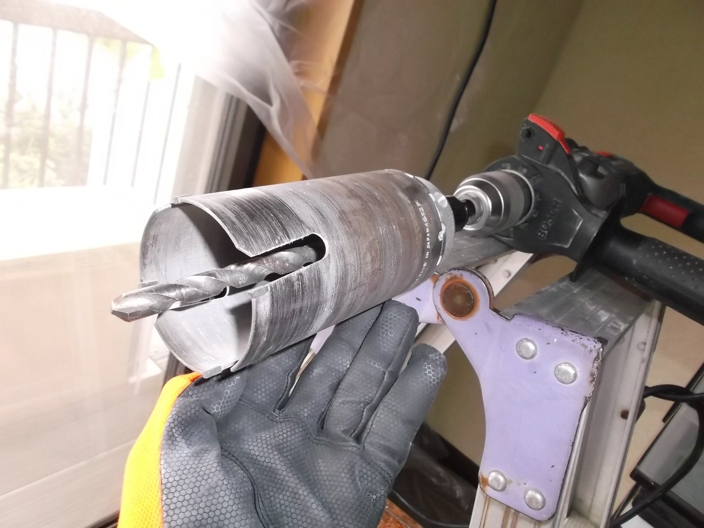 工具のドリルはこんな物です。これを使用して壁に穴を開けます。 今日のお客様の壁は、内壁が石膏ボードではなくコンパネでしっかり補強してあり、外壁はALCの外壁材です。
