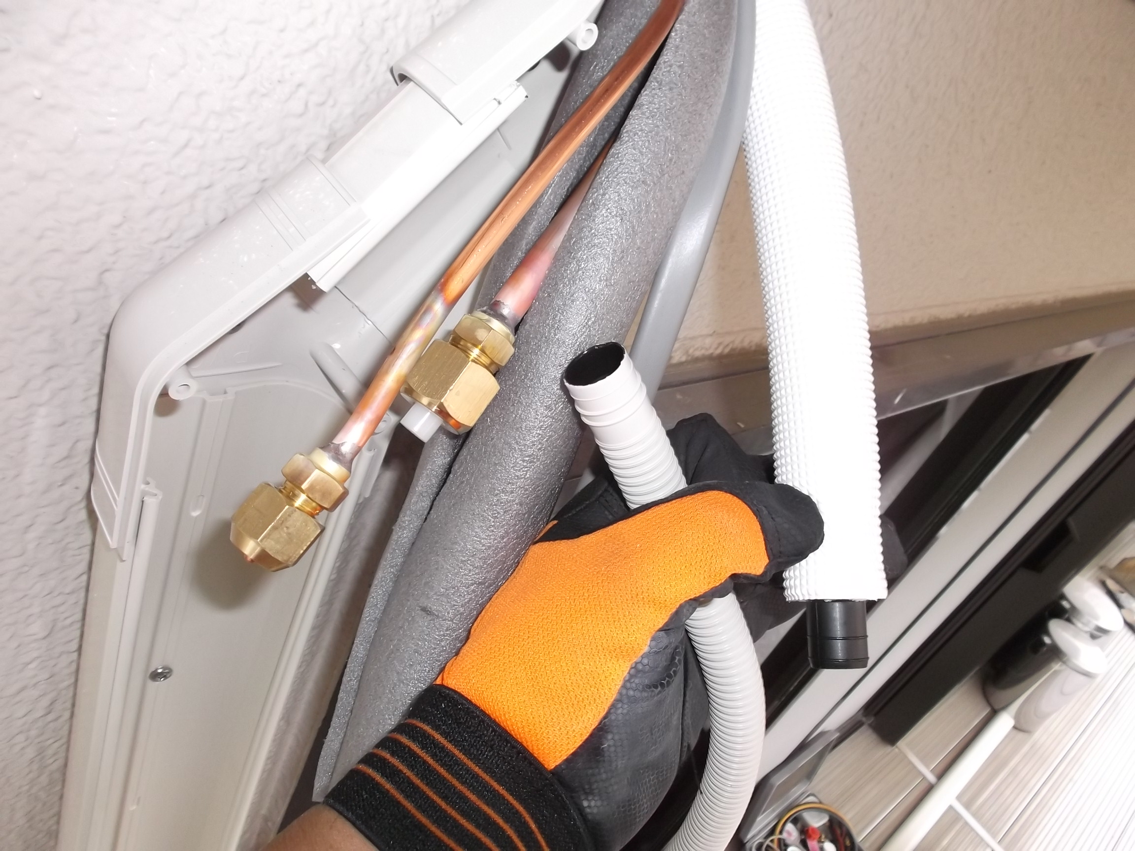 開けた穴に銅配管・電線¥・ドレンホースを通してみると、こんな感じの写真になります。スリムダクトカバーは先行して、ALC専用のネジで固定しておきます。手で持っているのが通常使用する「ハイクオリティードレンホース」です右の太く見えるホースには断熱材が付いています。 室内機の真裏が外壁(室外)ならば、断熱材の無いドレンホースを使用します。 ごちゃごちゃした説明ですが、室内では手で持っているドレンホースを使用する事はありません。 使うと「ホースが結露」して、ポツポツ水滴が落ちて来ます、、、。