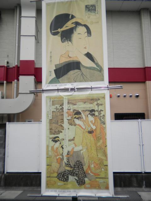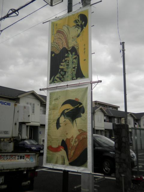 スタッフブログ 2012年10月31日みつわ横町歌麿通り商店会所有の、歌麿の浮世絵を街路灯に取り付け