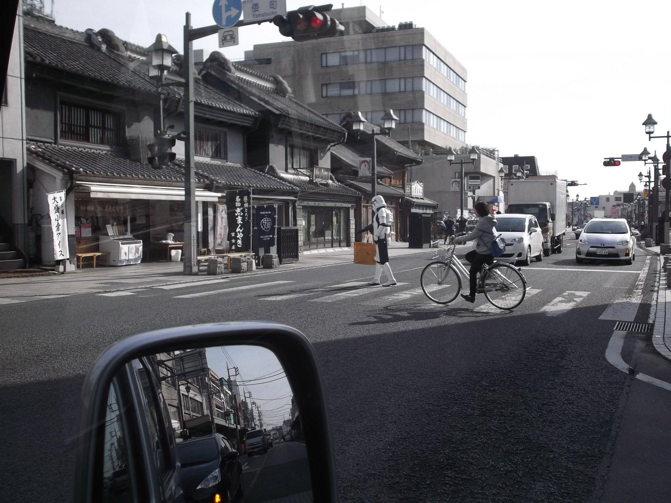 「確かアイツは」、あの、スターウォーズ帝国軍の機動歩兵所属の『ストーム・トルーパー』、、、 白い装甲服をまとった帝国軍がついに、平和な『蔵の街 とちぎ』に攻め入って来たのか、、、。 交差点で信号待ちしている、我々「平和な夫婦」の目前に突然現れるとは、、、。 何と手には「紙袋」を下げている、、、。 そして、何故か「猫背」ぎみな歩き方、、、。 怪しい。 交差点向かいには足利銀行、、、もしや「銀行強盗」、、、 いや、紙袋を下げているのなら「買い物帰り」かも、、、。 白と黒の配色は、「蔵造りの街」を意識したものなのか。