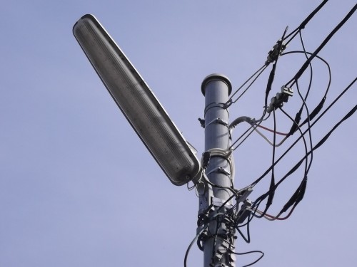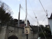 それにしても混み合っている電線達です。動力線・電灯線・メタルの電話線・・・そして光ファイバー線で、その中に防犯灯の器具が付いてます。 LEDの防犯灯が到着したら、安全確保して交換させて頂きます!!!