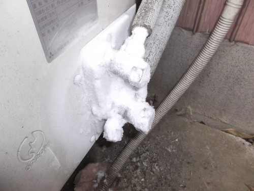 室内機のランプは「運転ランプ」「霜取りランプ」が点灯したまま送風運転しかしていませんでした。 室外機を確認に行くと写真の様に両方の配管が「真っ白に雪化粧」してます。 片方の配管だけなら冷媒不足・過多など考えられますが、両方となると冷媒の流れが悪くなっていそうです、、、。 22年間以上も頑張ったので、この辺で選手交代をお客様にお願いしました。 お客様にも快諾を頂きました。 寒い中、しばらくファンヒーターで我慢してください。 極力早目に交代して頂き、快適になるようガンバリマス。