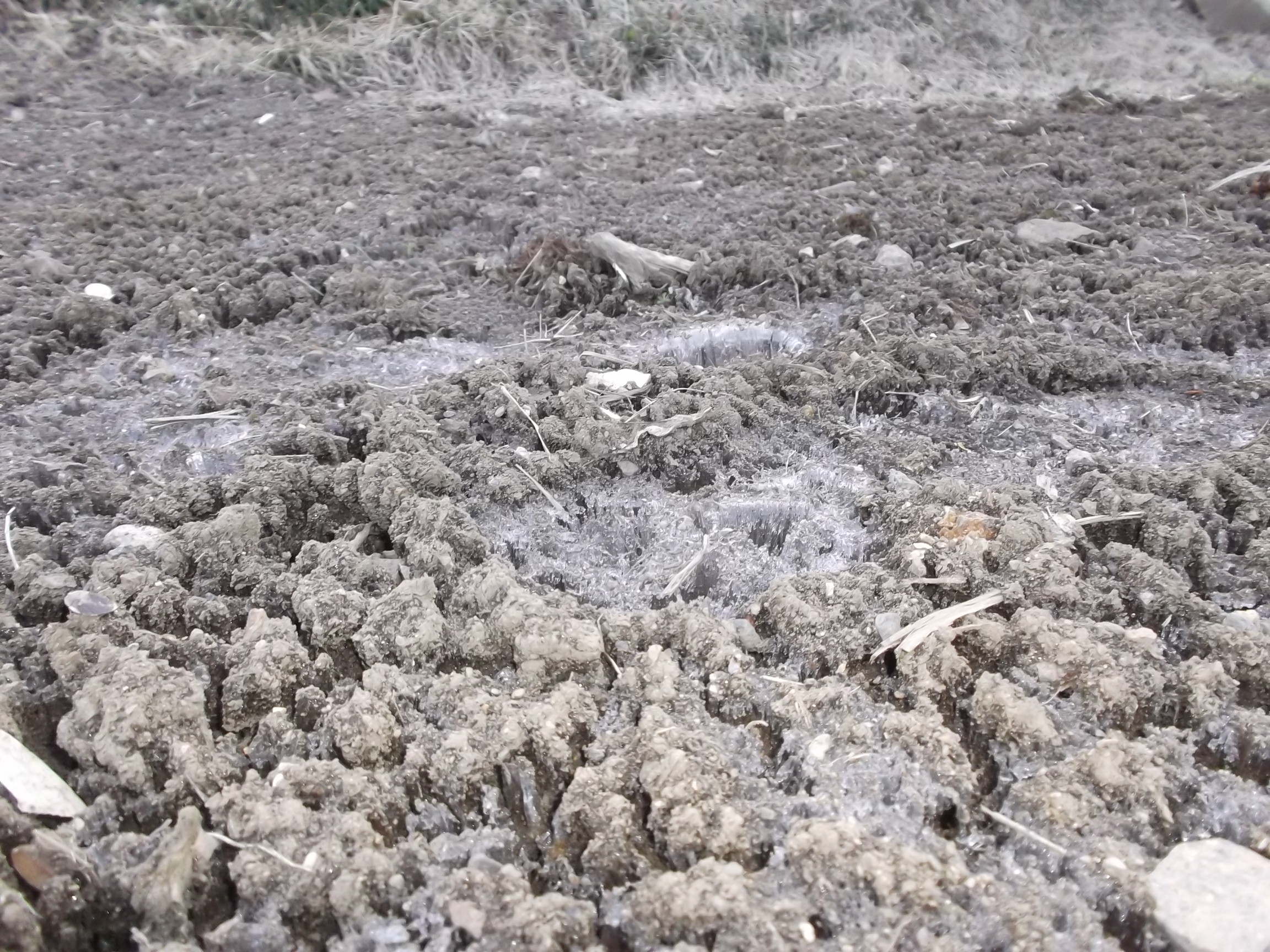 霜柱が立っている朝一の現場です。 土の状態なので、これが溶けていくと靴の下に泥がまとわりついて、とても歩きづらくなります。 まるで「鉄下駄」を履いて歩いている様です、、、。