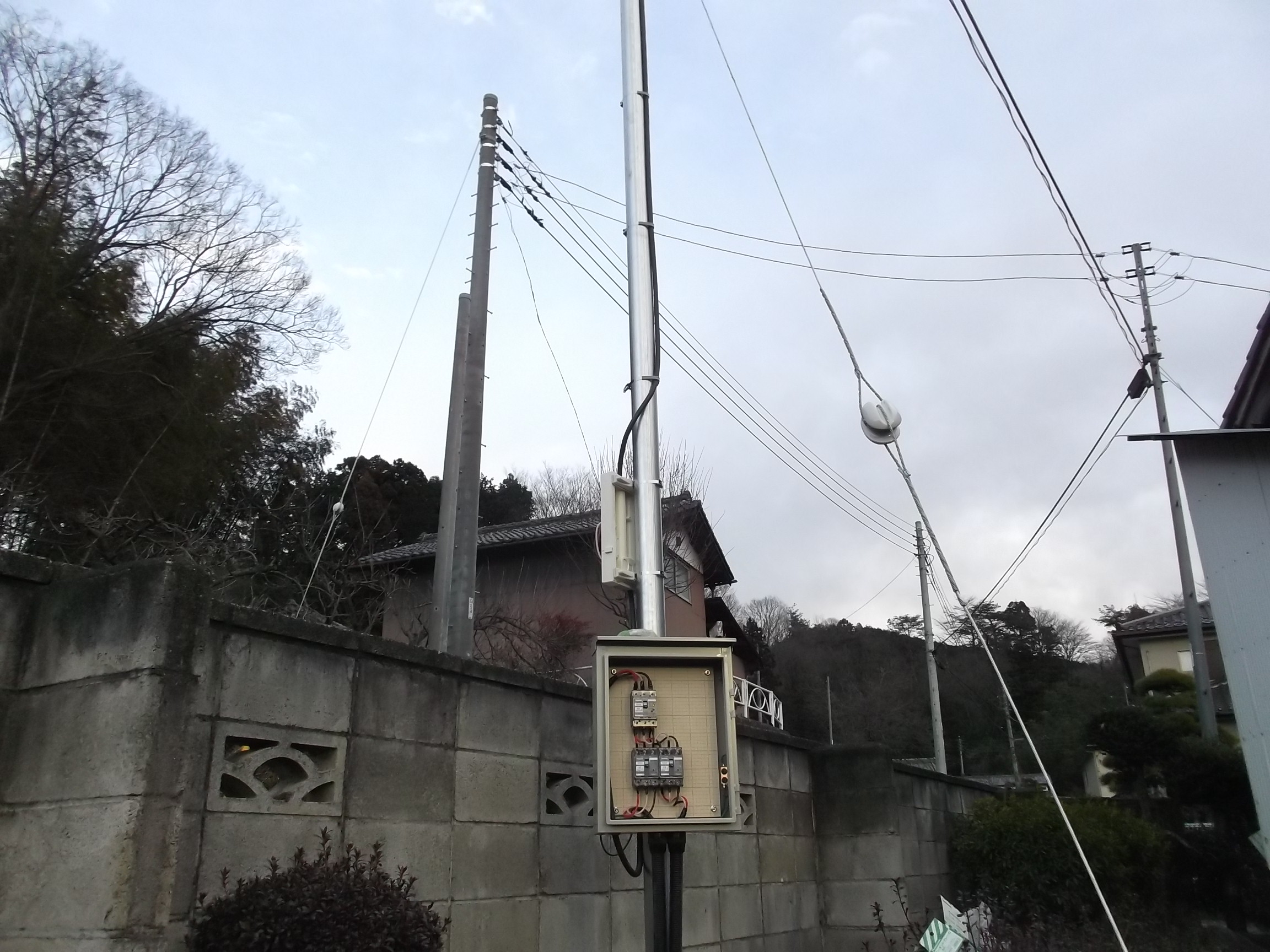 2015年2月8日 スタッフブログ「防犯灯が切れて付かない、、、」と連絡頂いて確認にお伺い。 コンクリート柱でなくて「鋼管柱」と言われる金属製の柱でした。 コンクリート柱なら「足場釘」と言われる金属製の棒が出ていて、それを頼りに上れます。もちろんヘルメットと胴綱と言う太いロープの様な物を使い安全確保してますが、、、。 金属製「鋼管柱」にはほとんど在りません。 いつものハシゴではとどかないし、「LED」がご希望らしいのでひとまず今日は「現調」だけにしておきました。