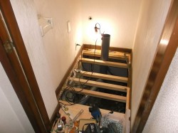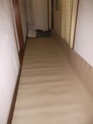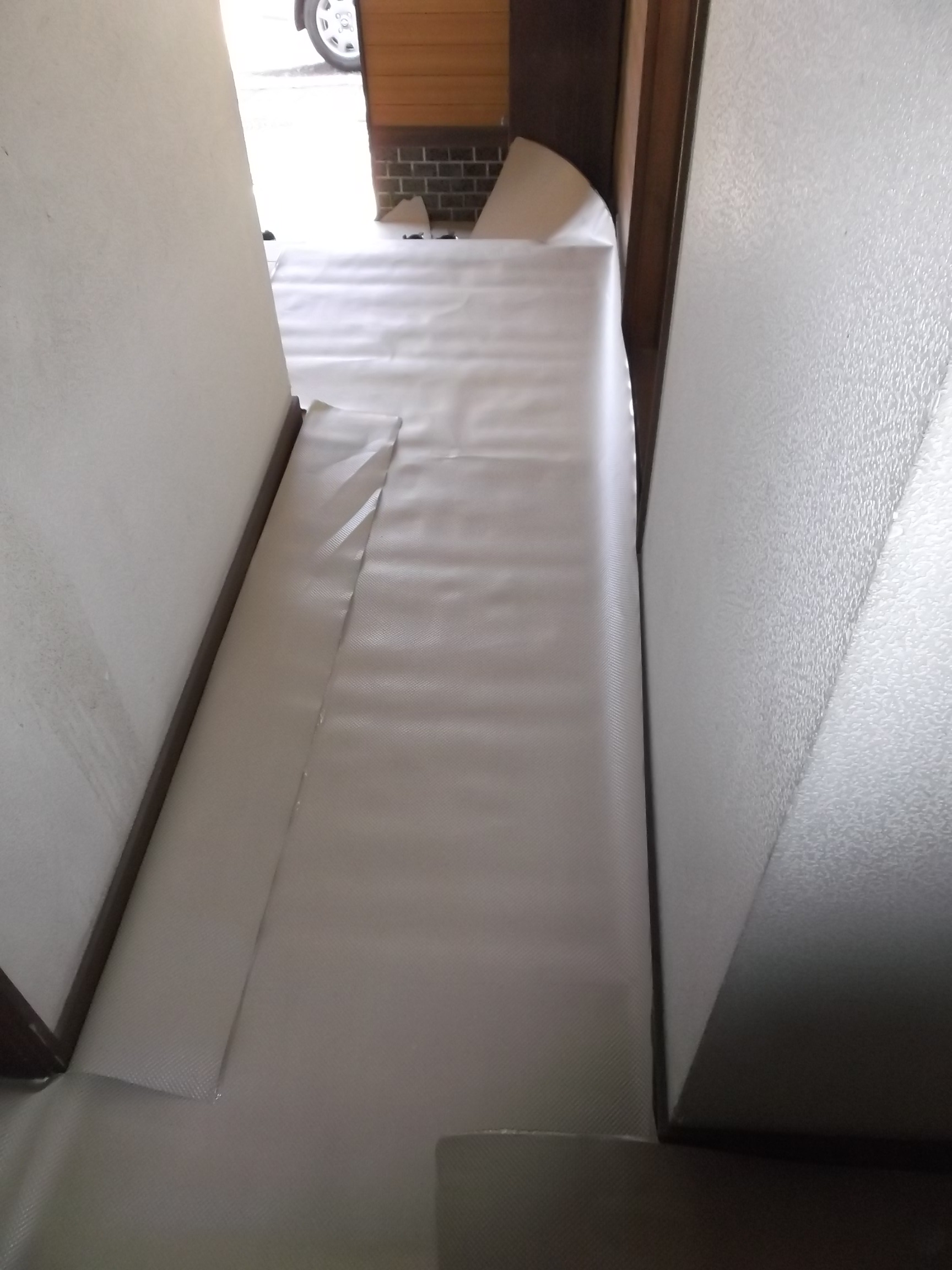 玄関・廊下を養生シートを敷いてから工事開始です。お客様も安心だし、工事する私共も工事に集中出来ます。 何より後方付けがラクラクです。