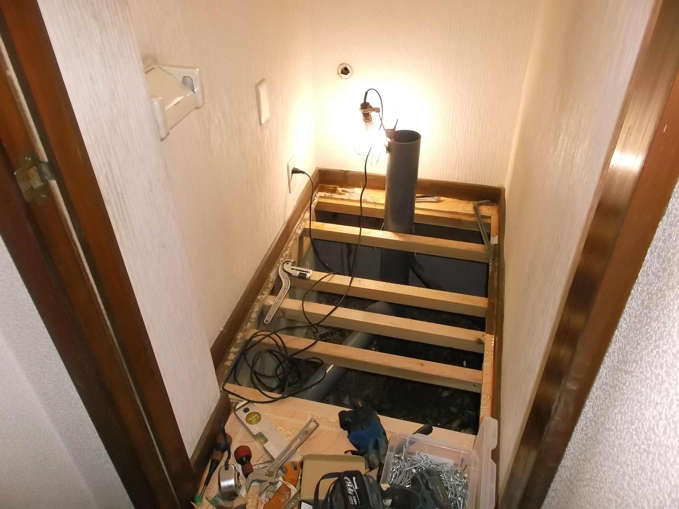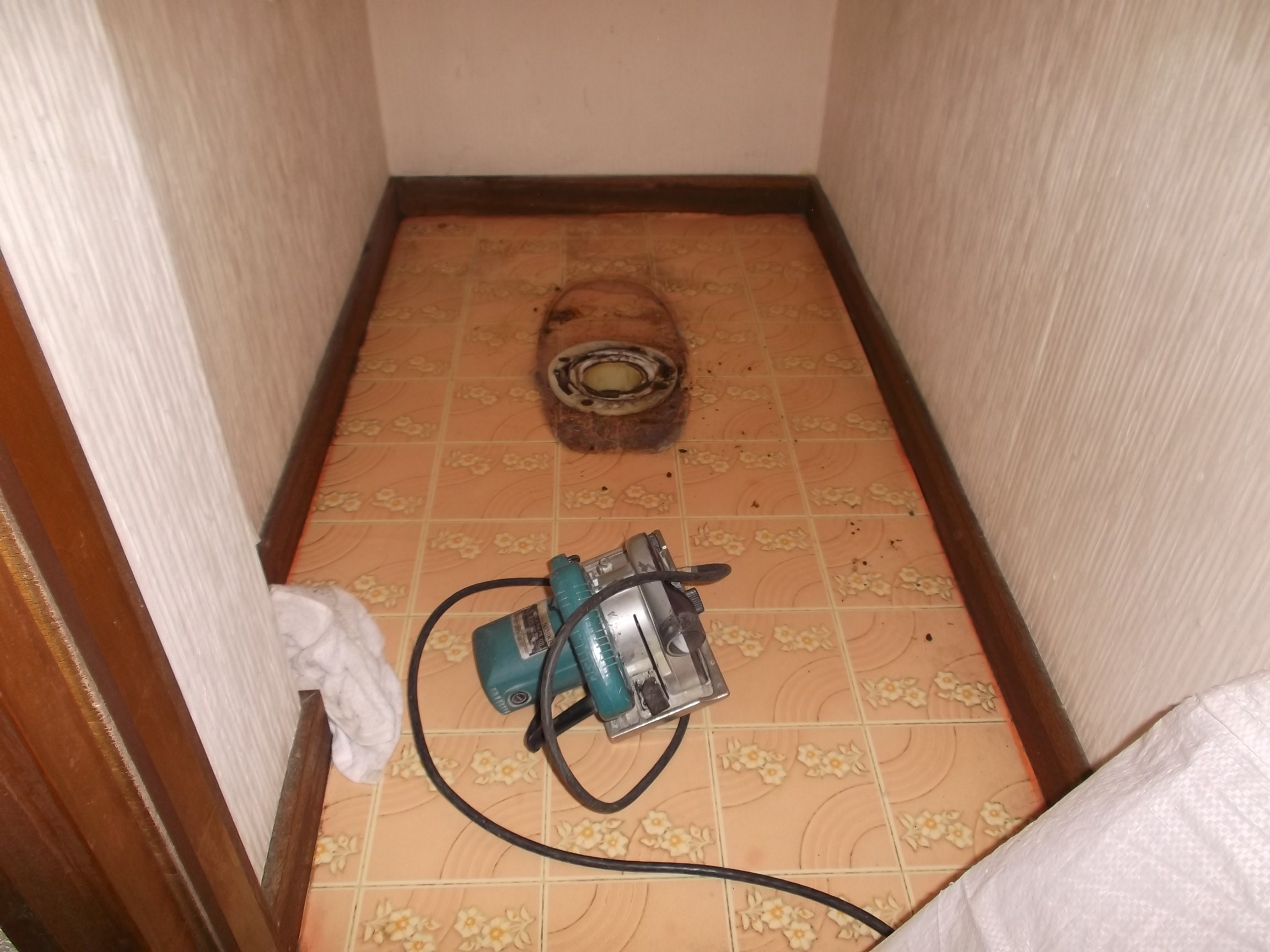 便座・便器を取り外すとこんな様子です。通称「丸のこ」と言う工具で床を切り抜いていきます。