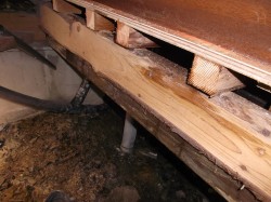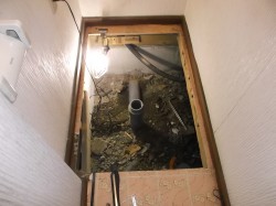 床下が現れました。 真ん中の配管が下水や浄化槽に配水する管です。 ここでトイレの床が「フカフカ」する原因がはっきりしました。 便器付近からの漏水かと想像してましたが、そうではなく別な給水配管からの「水漏れ」が原因でした。写真右の反対側には洗面化粧台と洗濯機が在り、その給水管からポタリ・ポタリと水が漏れています。