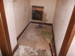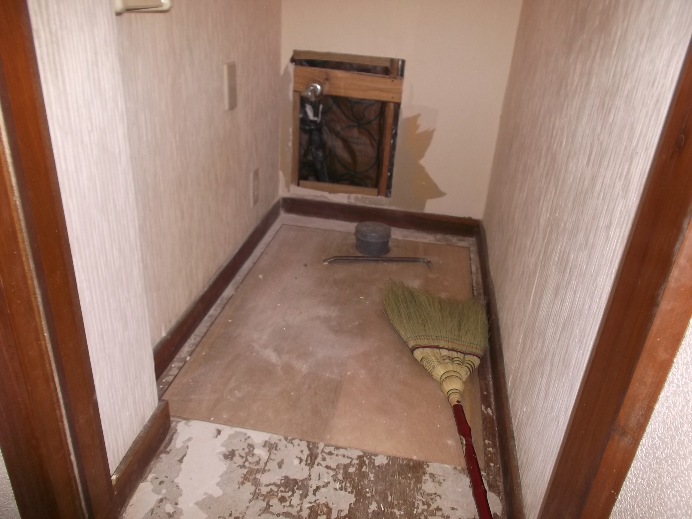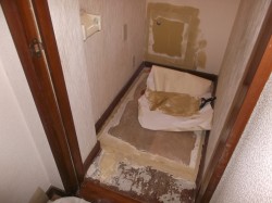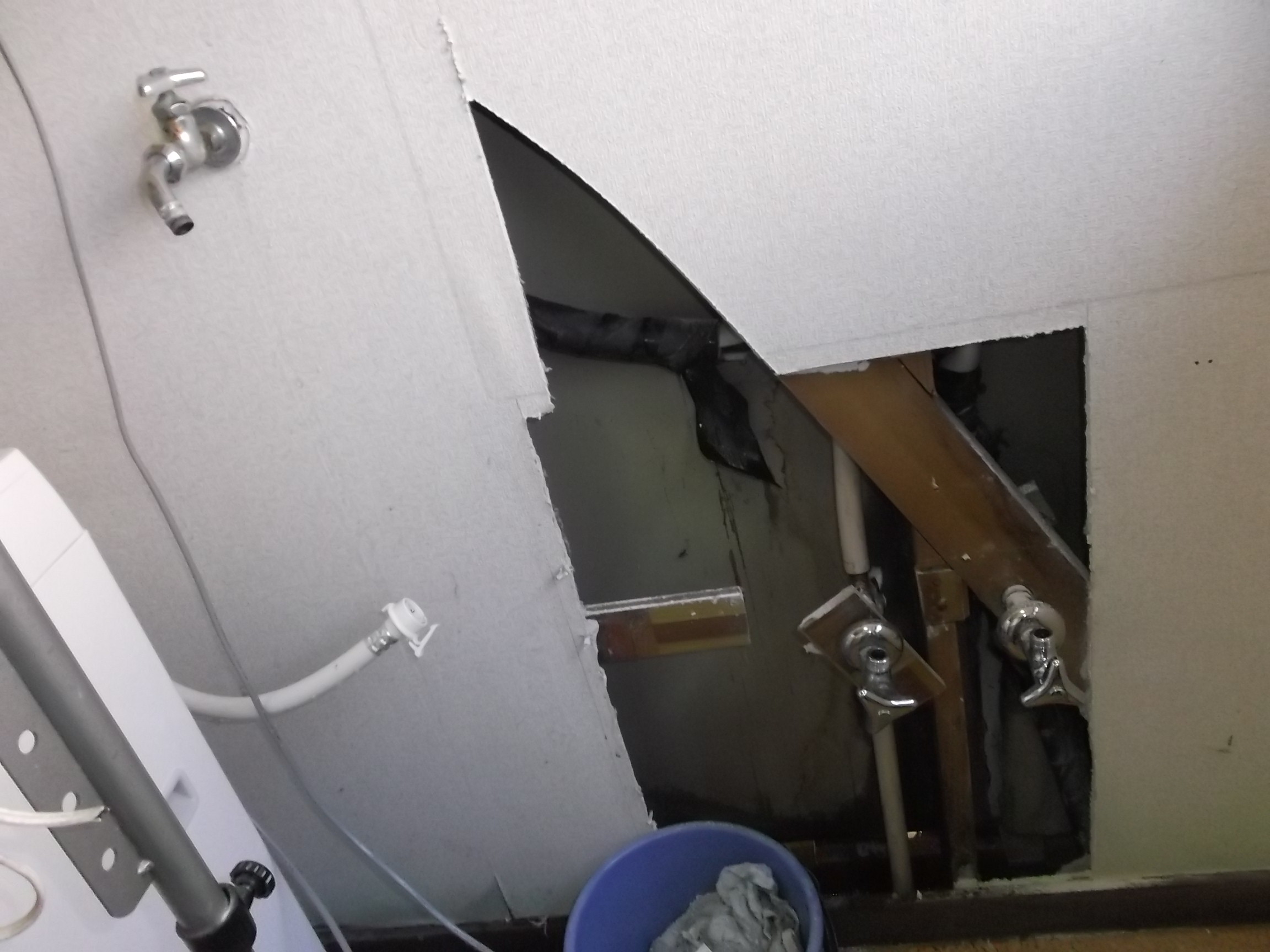お客様に確認してもらい、急きょトイレ班と漏水班に分かれて工事します。 急がないと午後過ぎにクロス屋さんが床材を張りに来てしまう、、、。 今日は3人で工事で来てます、、、心強いです。