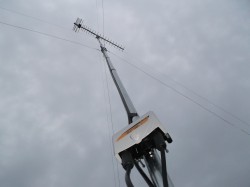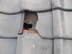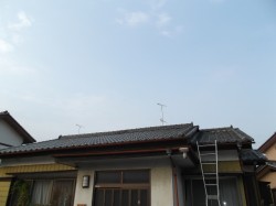 ここはお客様所有の借家でして、しばらく入居者が無くそのままにしていたそうです。 UHFのアンテナの先端が瓦を突き破り屋根裏まで入ってます。 午後3時過ぎからのアンテナ工事でしたので、暗くなる前に完了したく、撤去し直ぐに工事に掛かりました。