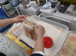 2015年11月10日 スタッフブログ『日々のお仕事をこなしながら、年末感謝祭の案内状と来年のカレンダーを全て手配りの真っ最中、、、』と言いたいが、手配りが中々進まない、、、。 『一日30軒訪問!!!』と自分に号令を掛けても、お客様からのコールが次々と来ます。 手配りだけでなく、展示商品の発注・店内の模様替え・店内大掃除、そしてアトム名物『ターポリン』の作成( 希望的には2枚は作りたい ) 『ああ!!! 新米詰め放題!!!』 イベントの袋が決まりました。