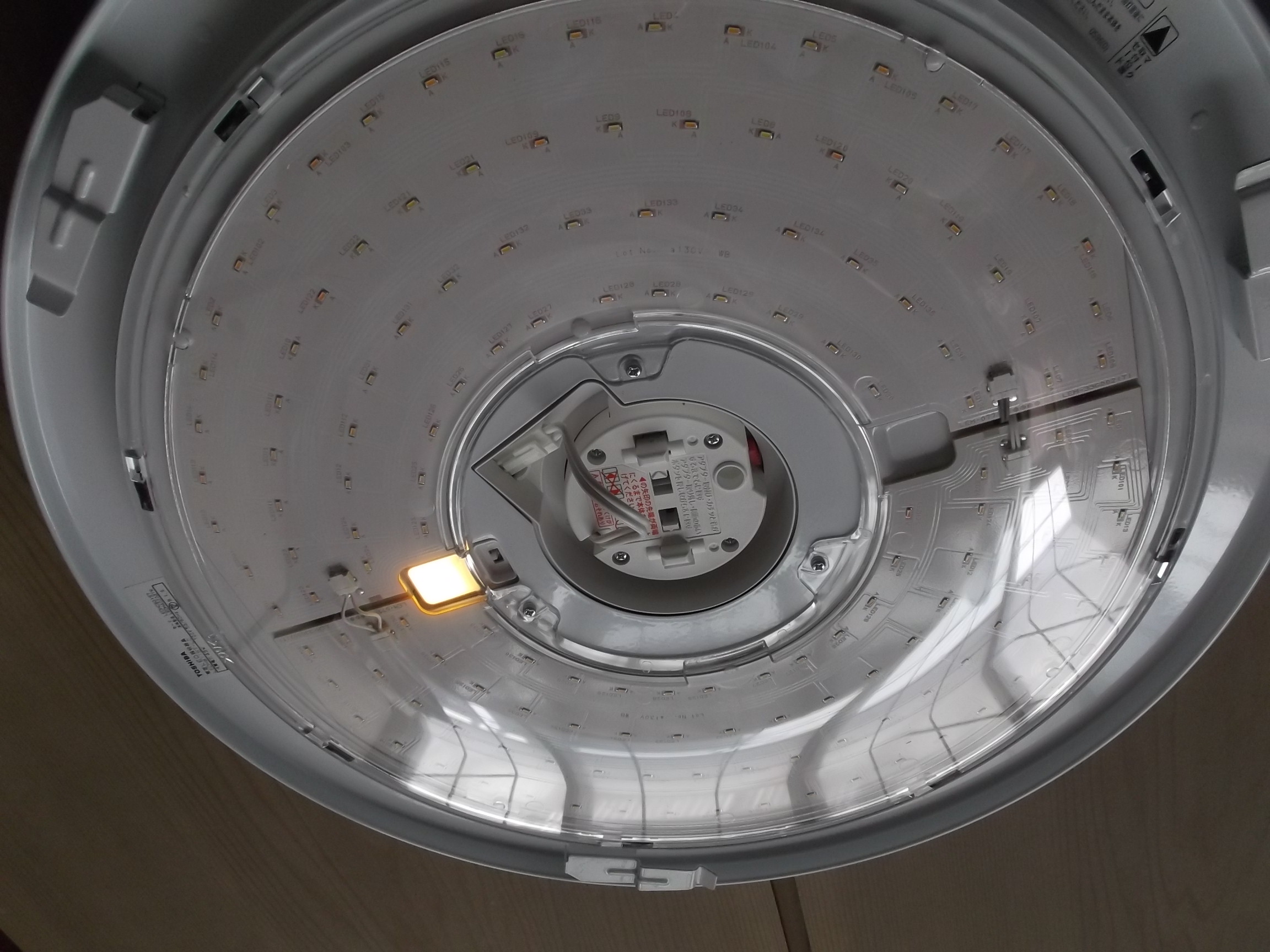 LED照明のカバーを取ると、器具にチップと呼ばれる「LED」その物がたくさん見えます。 この粒状の物が発光してお部屋を明るくしてます。