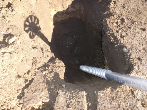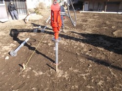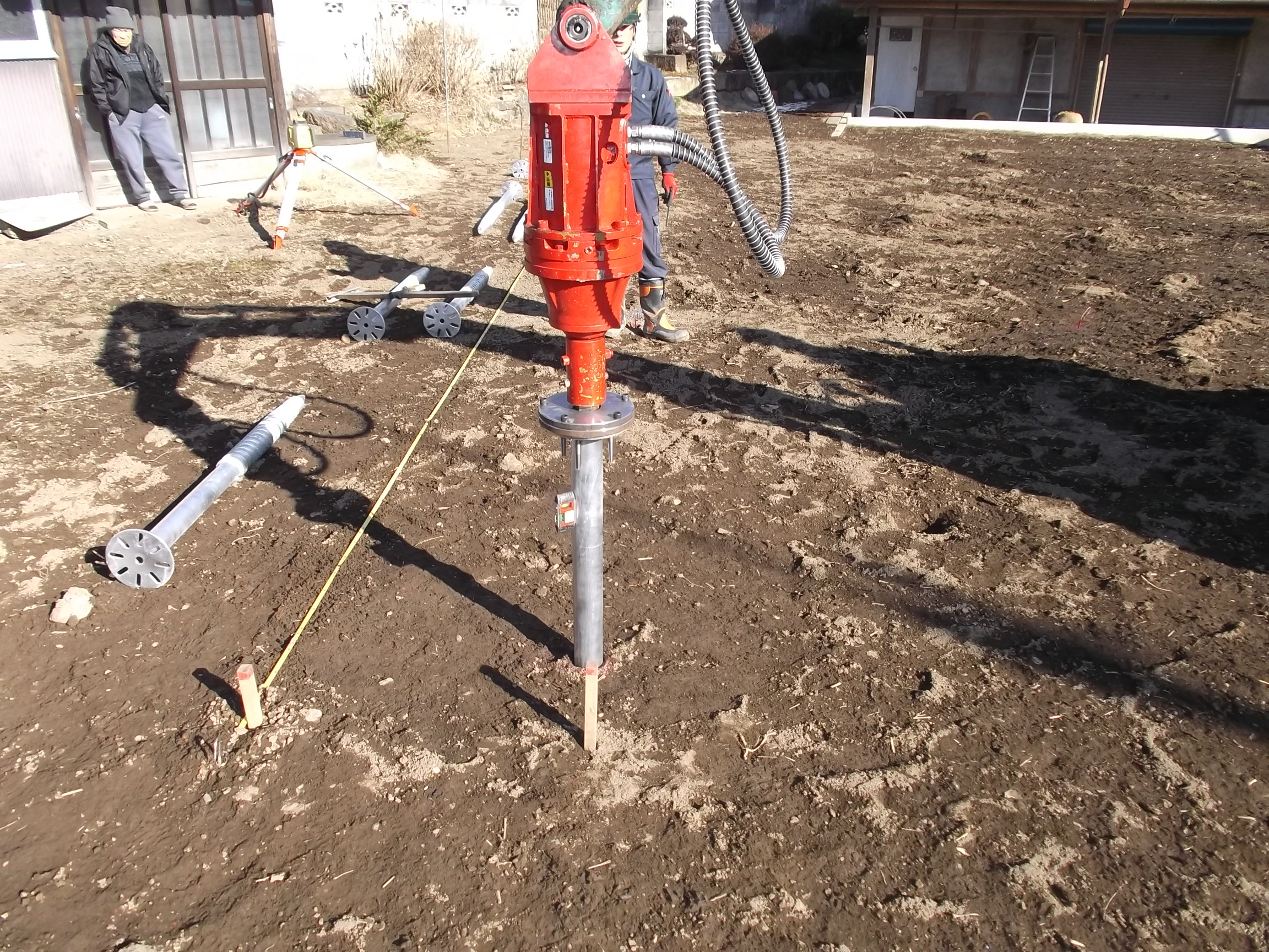 重機の先に専用のアタッチメントを取り付けて、回転させながら杭を地中に埋めていきます。 事前の引き抜き調査で、1本の杭で900kg前後の引き抜き強度が取れる地盤でした。 全て同様に、順調に杭打ち出来る予定でしたが、さすが「現場仕事」です、、、。 障害物で杭が打てませんです。 最後の2本が打てないのでした、、、。 午後5時近くなり、あたりも薄暗く成り始めたので『翌日、再試合』に望みを、、、。