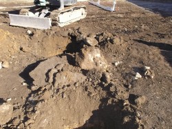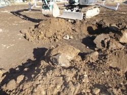 重機の下に映る塊は『岩石』、、、です。 これが真下に在るんじゃァ、、、「デカネジ」の杭なんか、地中に入って行く訳在りません。
