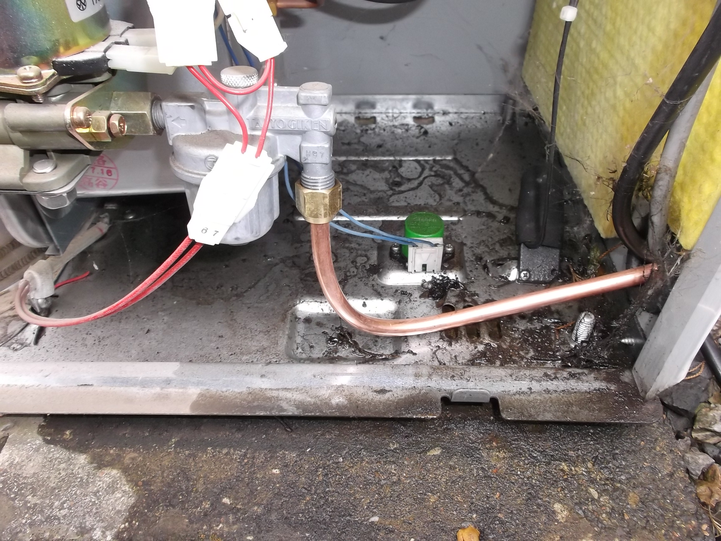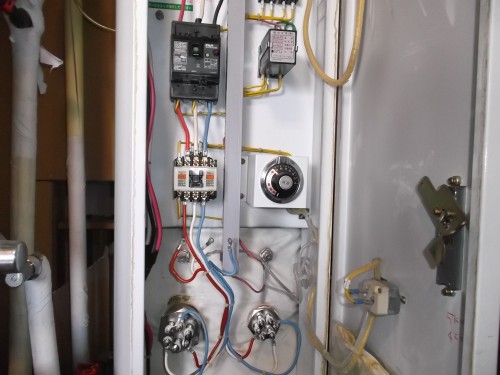これは温水器です。 深夜電力の温水器ではないいつも通電・湯沸かし出来る電気温水器、、、。 写真下側の大小のヒーターが悪さをしてしまい、ブレーカーが落ちます。 ヒーターの良否判定をするのみです、、、。 ヒーター交換はメーカーさんで無いと「保証しない」との事ですので、良否判定のみのお仕事でした、、、。 今回で2回目の良否判定の現場です。 常に80度のお湯を深夜電力で無く、沸かしています、、、。 ランニングコストは考慮しなくていいい特別な場所に在る温水器、、、、。