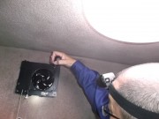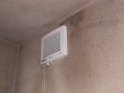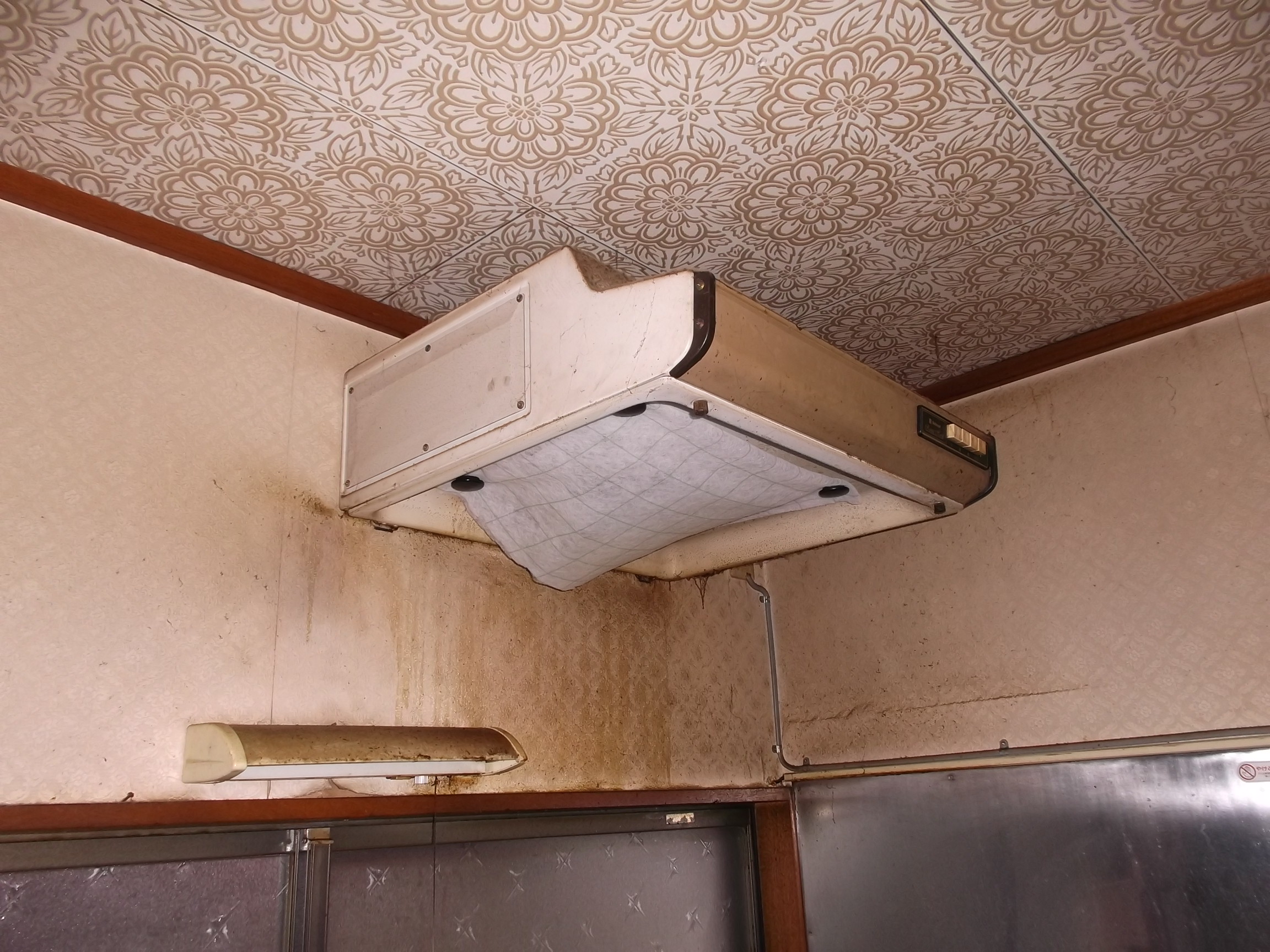 何故かお風呂場の壁は「モルタル壁」です、、、。 表面がザラザラしてますので、湿気で黒カビがうっすら付いてます、、、。 既存品の換気扇取り外しに20分、、、。 ネジがサビてて取れませんでした。 終了後台所の換気扇も診ます。