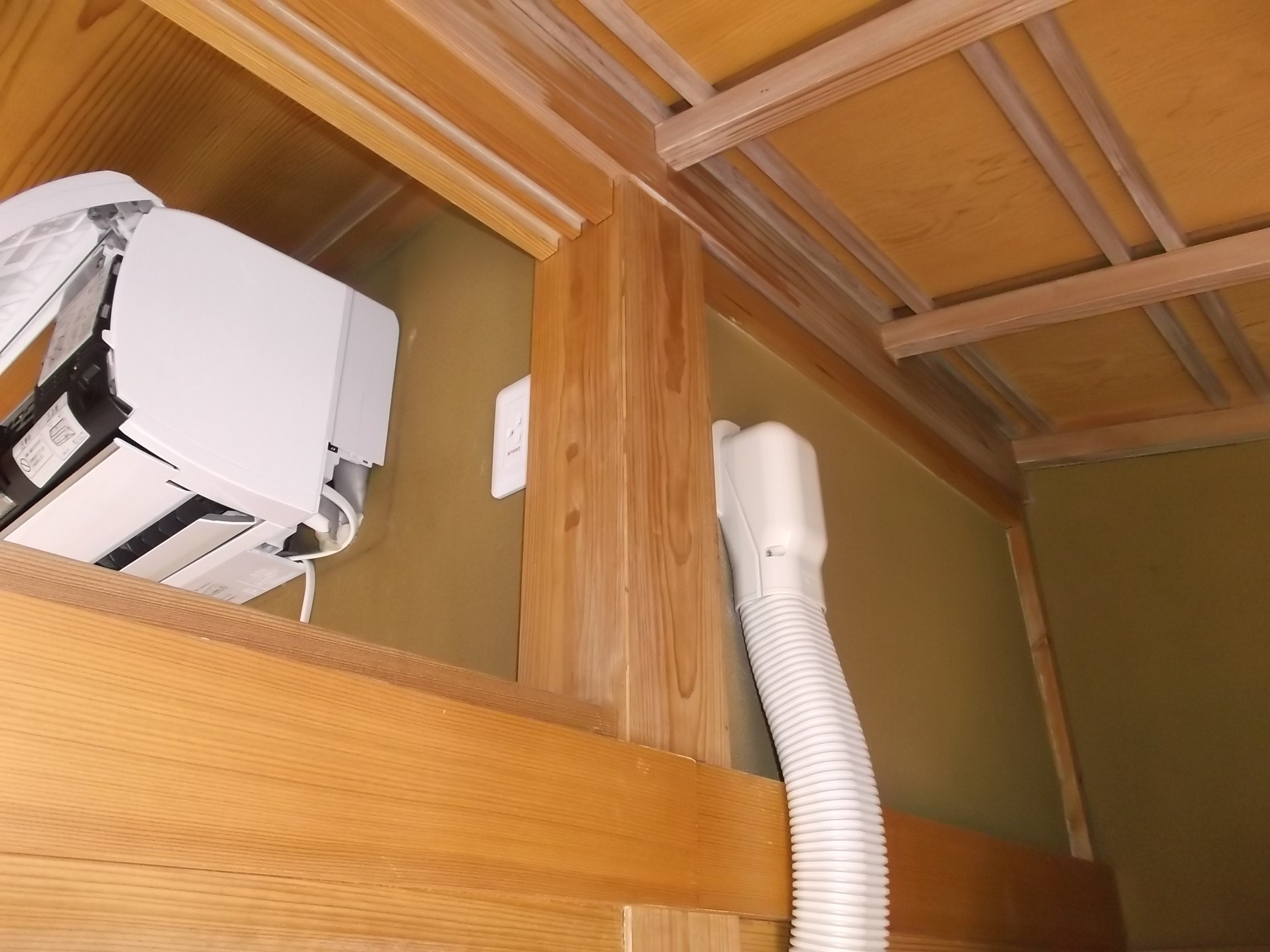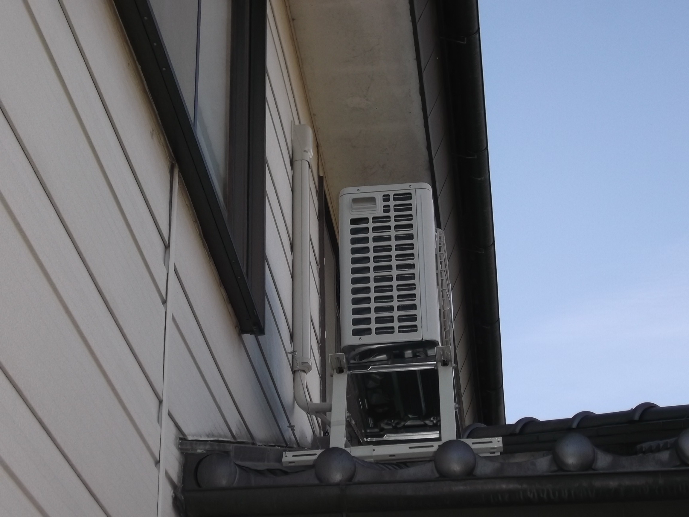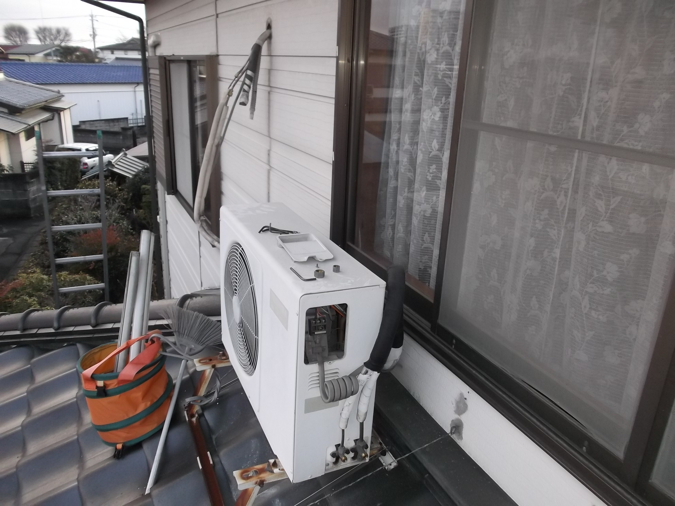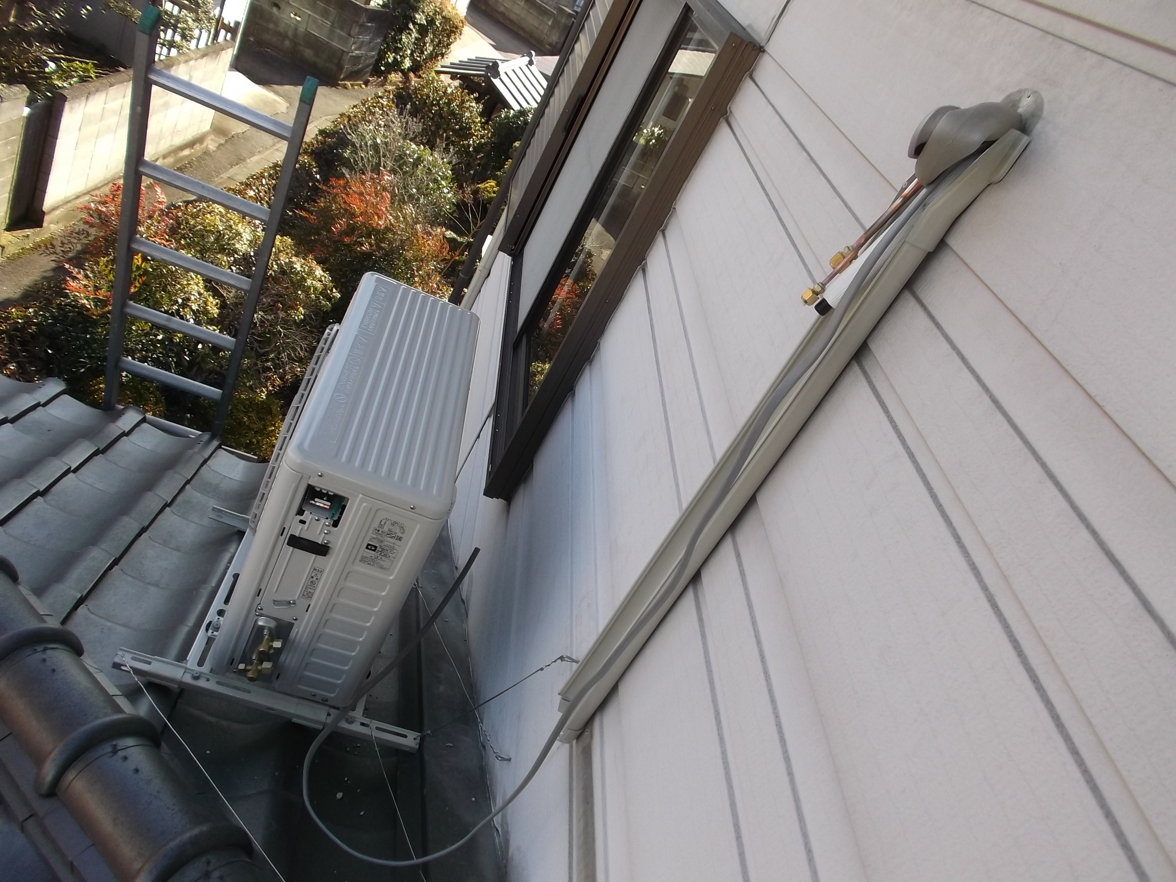 事前の現調の時に、お客様に状況を説明して在りますので「露出配管」で「スリムダクトカバー」を使用して廊下に配管し、それをさらに室外基礎部分に出して室外機に配管しました。 難儀な工事でした、、。 このエアコンの交換工事は、3人で8時半頃から2時過ぎまでの作業でした。 栃木市M様 ご依頼ありがとうございます。末永くご使用ください。