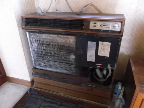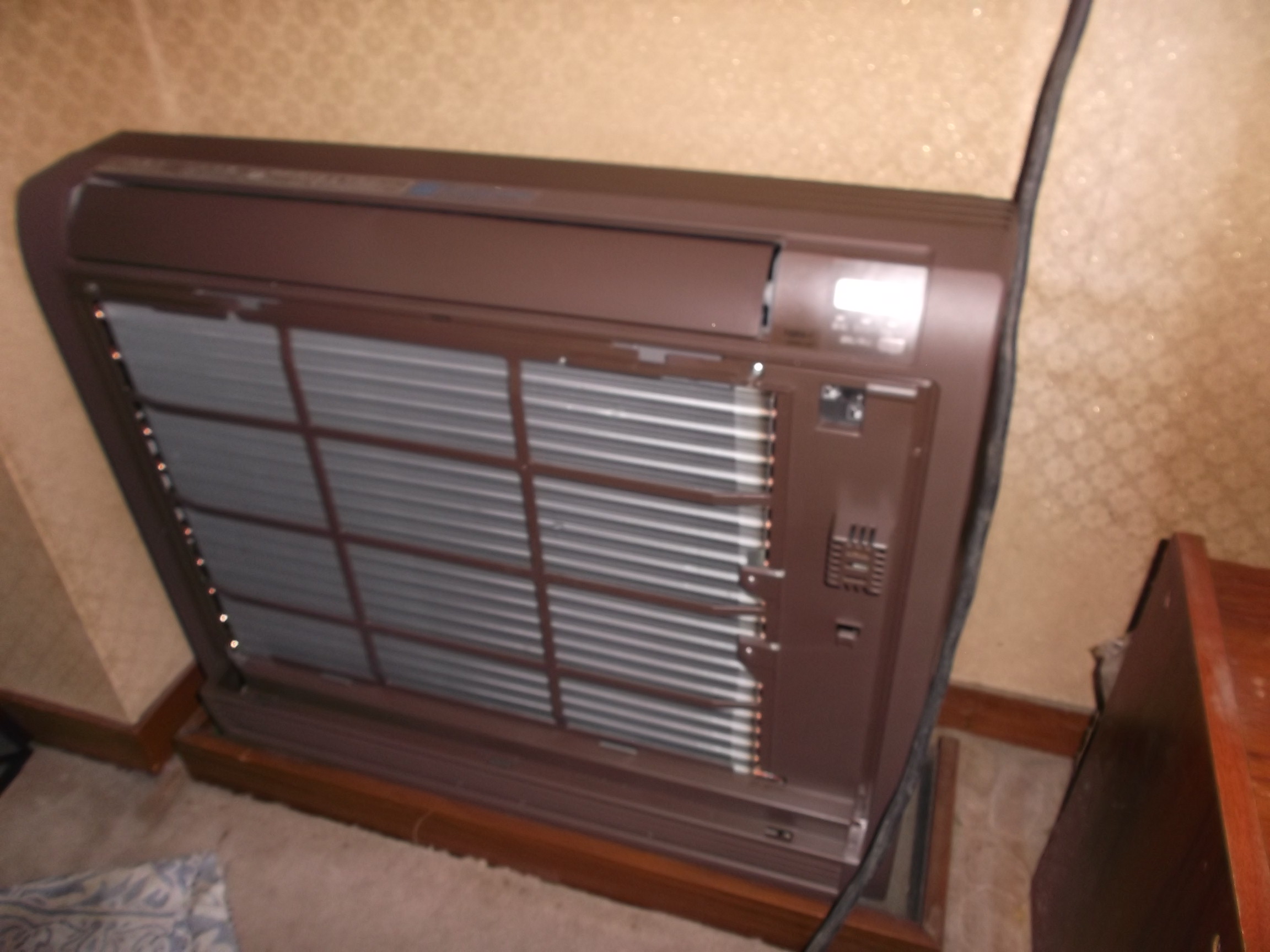 二十数年お使いの「床置きエアコン」が温まらないとのご連絡でした。室内機の熱交換する部分(車のラジエターの様に見える部分)が目つまりです、、、。永年の使用でしたので「洗浄」の方法も在りますが、交換をお薦めしてご依頼いただきました。