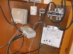 2014年12月25日 スタッフブログ初めてのお客様宅での工事です。『テレビが3台あるが、地デジしか見えないので、BS放送が見たい。』と知り合いの工務店さんのご紹介でした。 事前の現調でBS用の先行配線がされているのを確認していたので、BSアンテナ取り付けとブースター交換など完工と思いました。