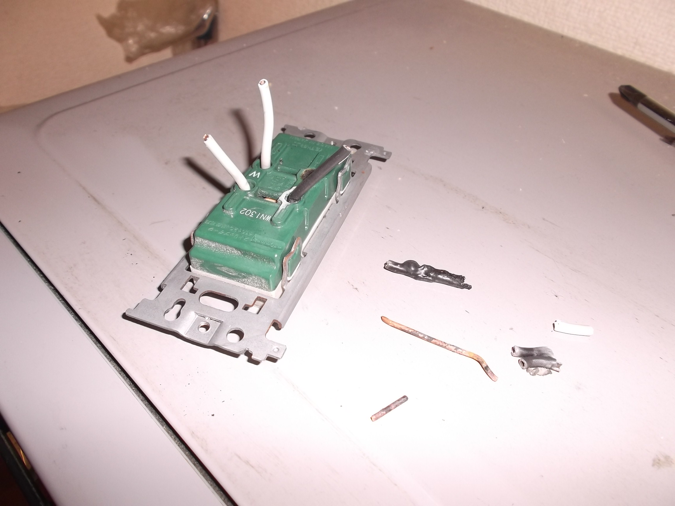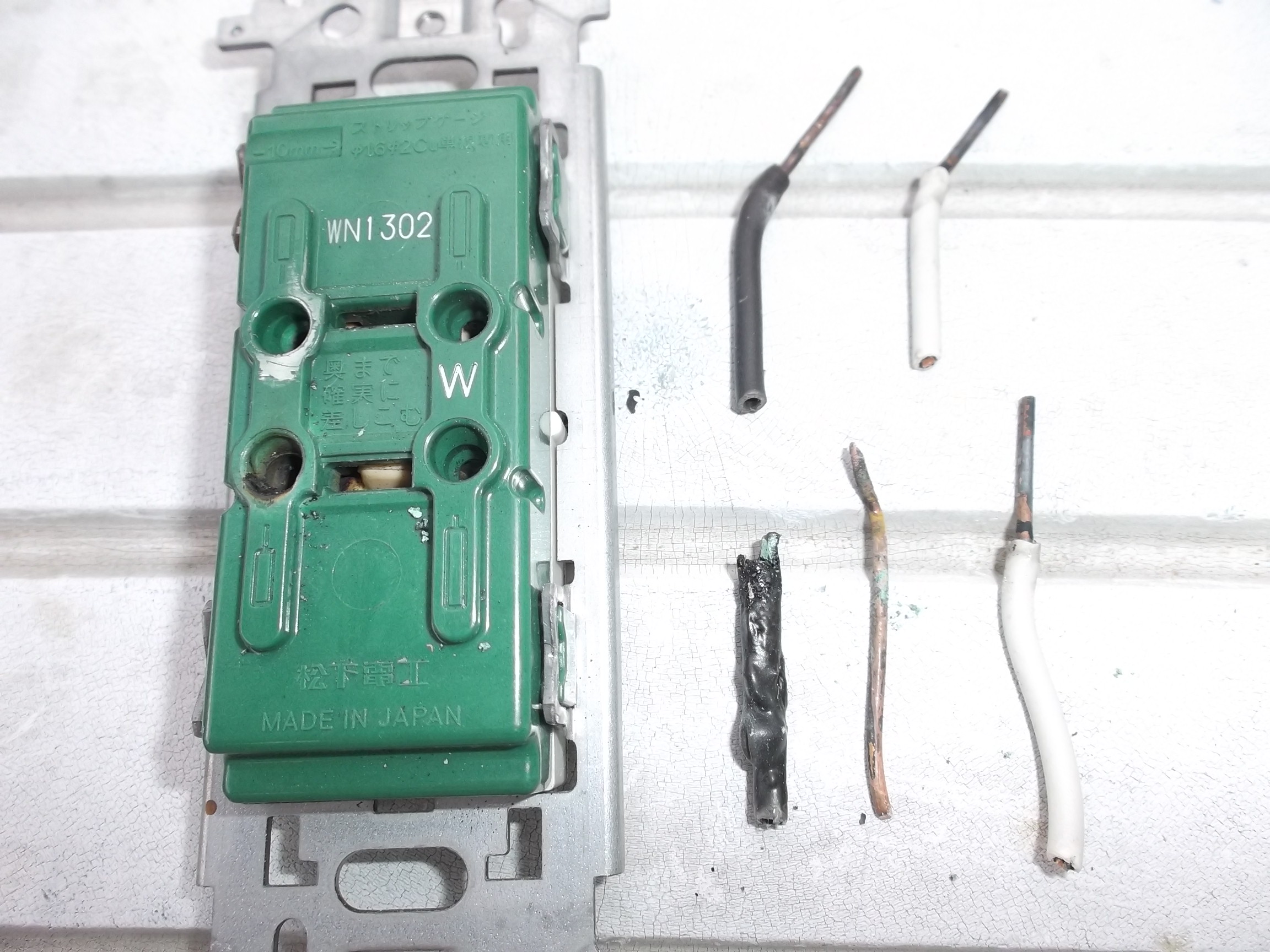 取り外して裏側を見ると電線の被覆(ひふく)が熱で半ば溶けている様子です。 電線も変色してやせています。このコンセントに電気製品を差し込んで使用すると、更に劣化していき、終盤には発煙・発火してしまいます。