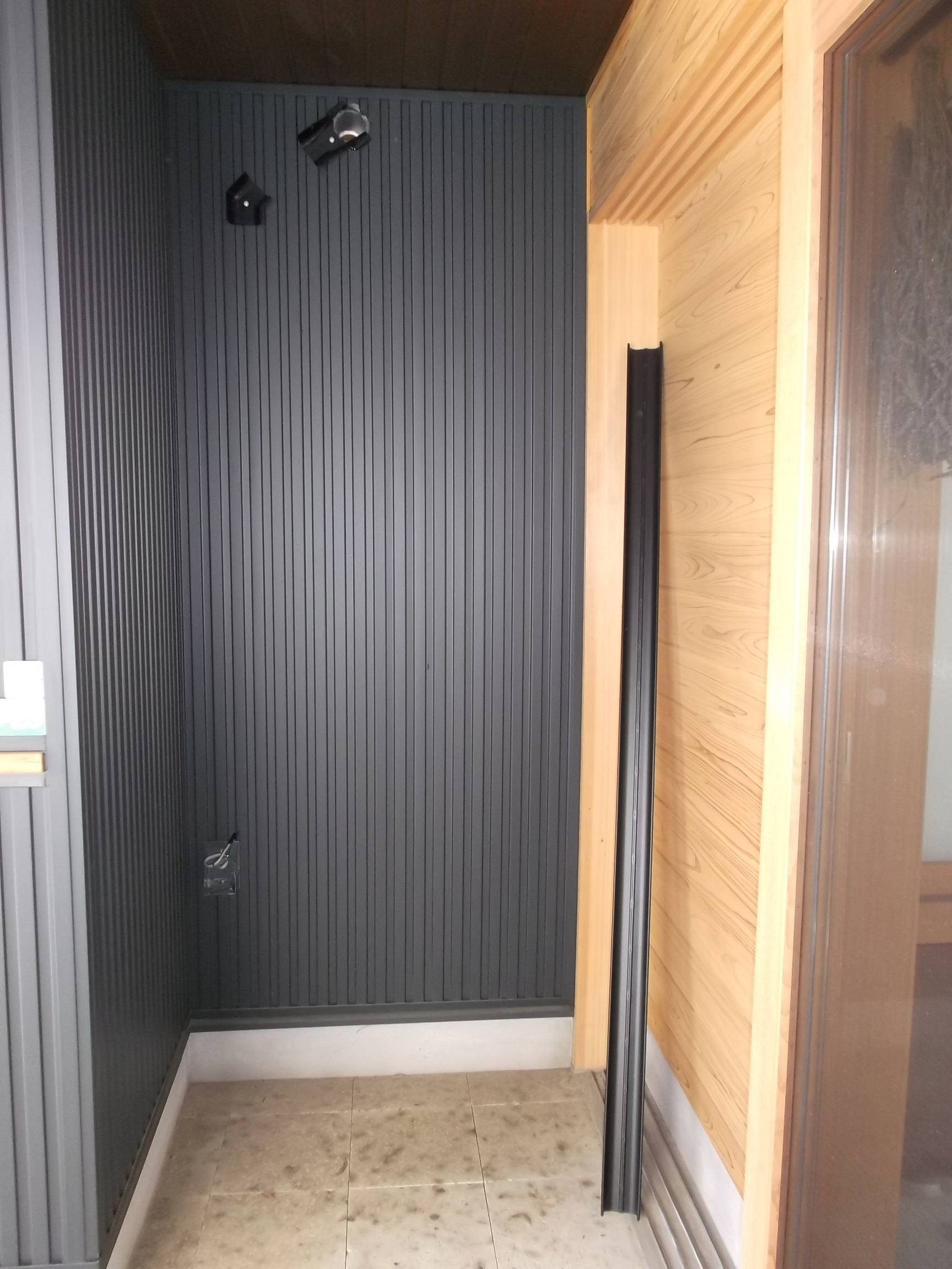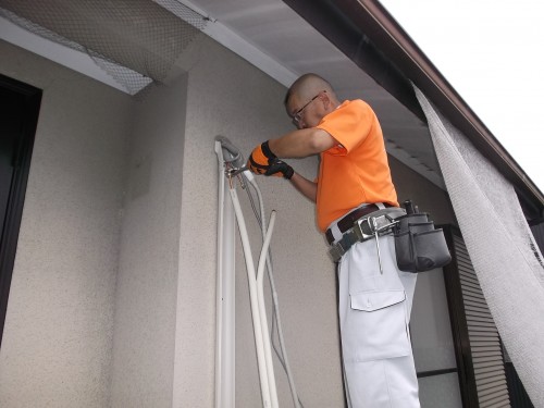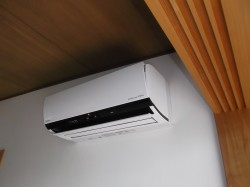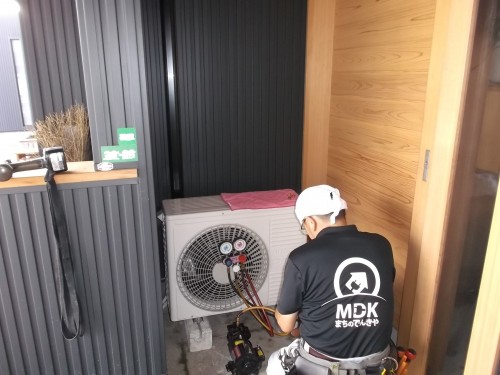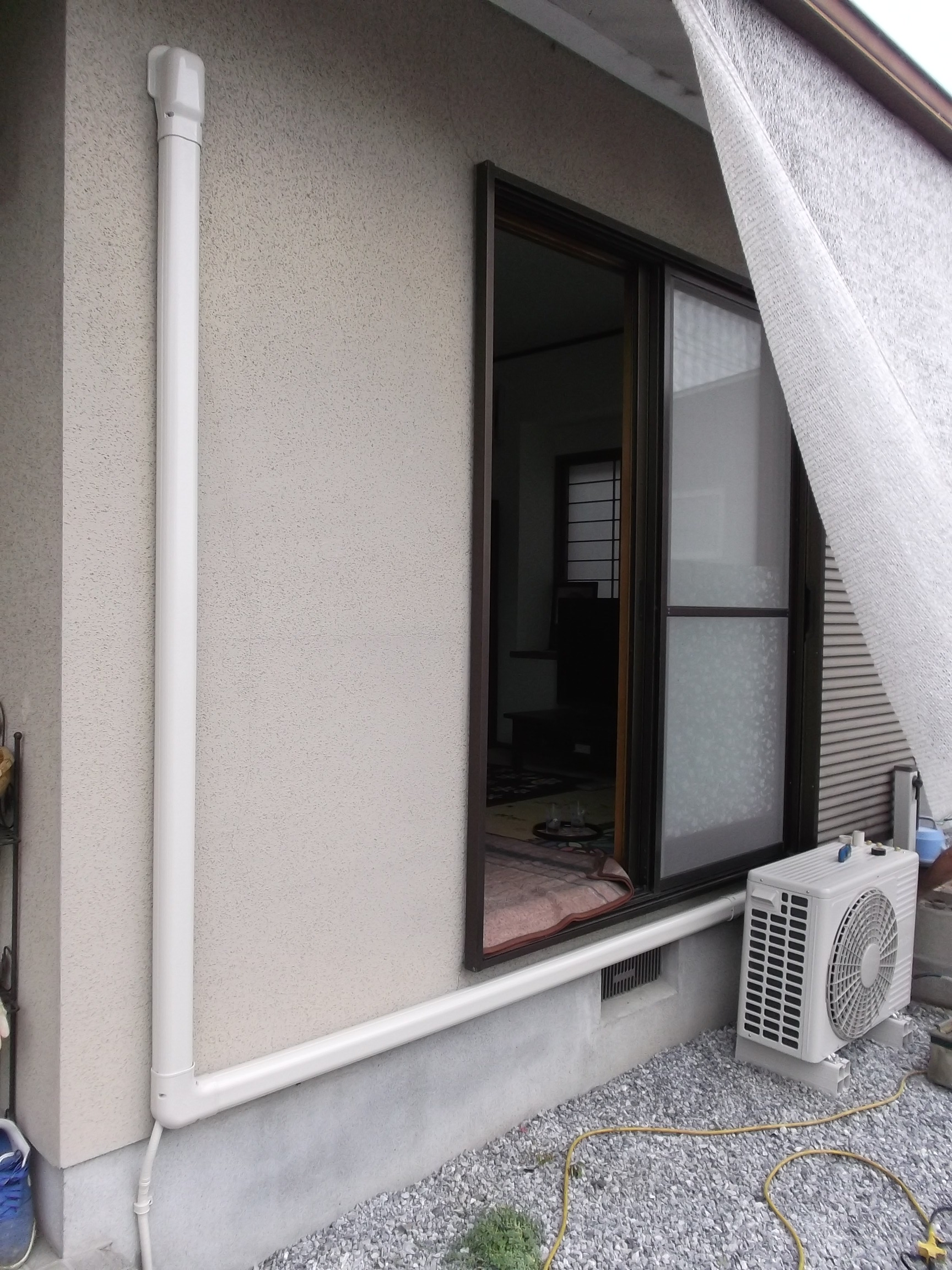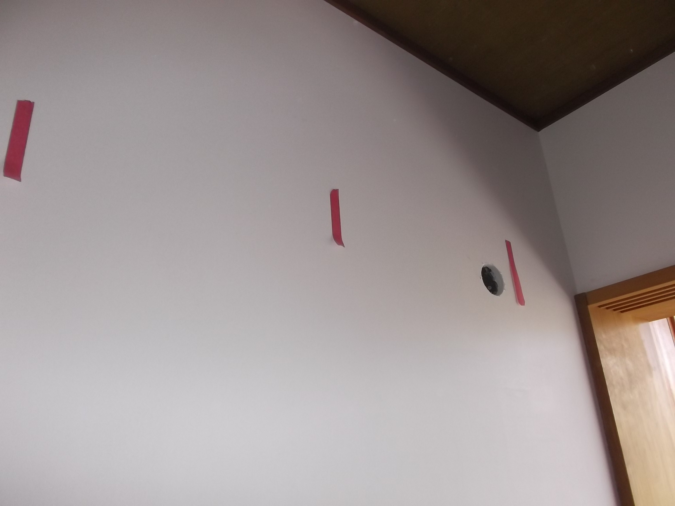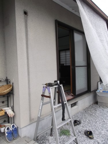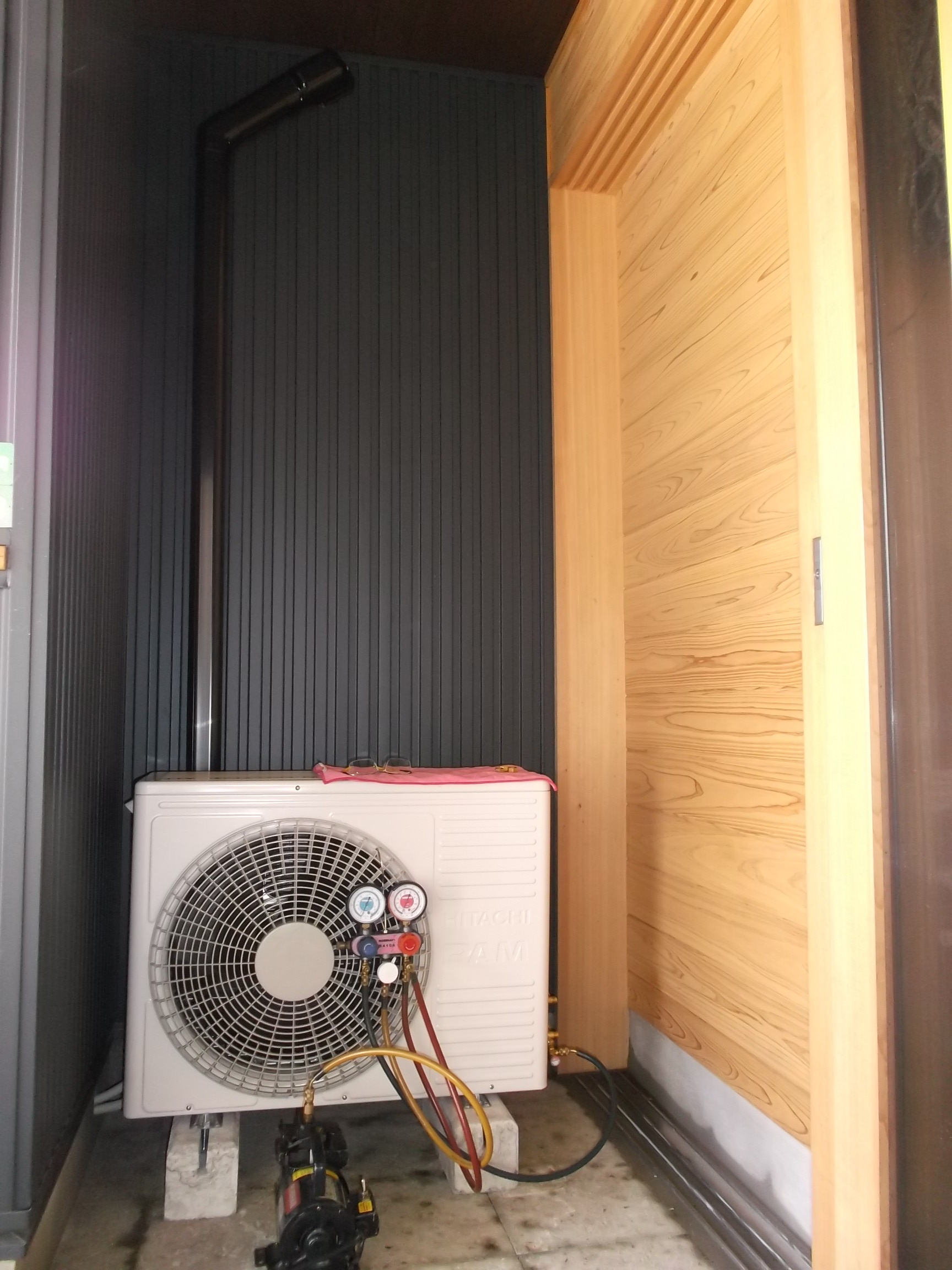 平屋のお洒落なお住まいです。 室内の壁は石膏ボードの上に塗装仕様の漆喰が塗られていて、作業手袋なんかで触ったら模様まで付くくらい真白かった!!!(消しゴムで、消すぐらい、、)外壁、これは玄関横に室外機用のスペースがバッチリ用意されています。 室内の写真を良く見ると、壁コンセントが無いのです、、、。 「見栄えが悪い」とのご意見で室外機の横に専用回路が用意されていたので、逆送りで電線を室内に、そしてコンセントは室内機左側の配管スペースに何とか隠しました、、、。写真は無いのですが、室内機左下カドの空間に隠しました、、、。