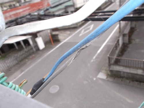 青い線と黒い線が見えます。黒い線を良く見ると擦り切れそうです。 看板の振れ止め用の針金が電線に接触して、針金が先に切れたらしい、、、。 電柱からの電線は、半分以下に擦れていましたので、ここからは東電さんへ電話連絡してお任せしました。 『離隔』をとらないと、こんな事に成る見本でした、、、。