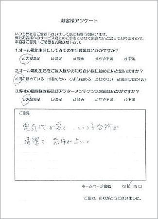 ご意見:電気代が安く、いつも台所が清潔で気持ちがよい。