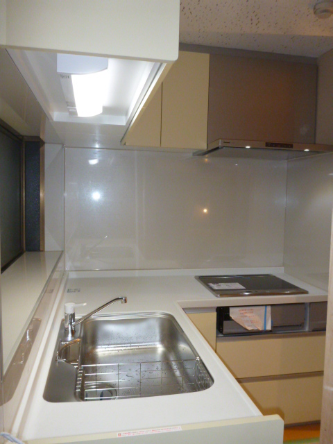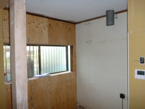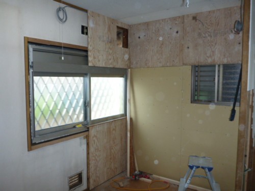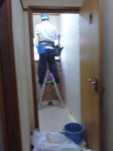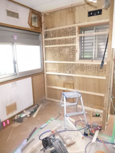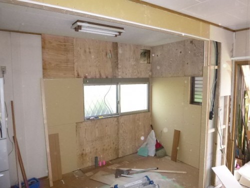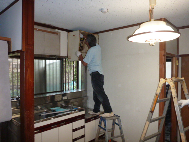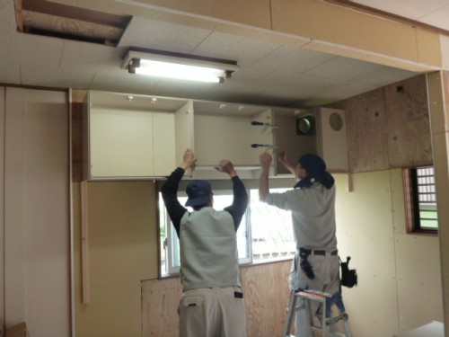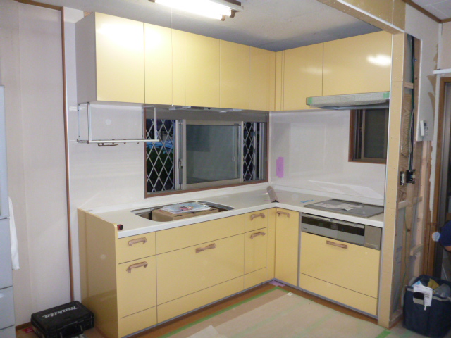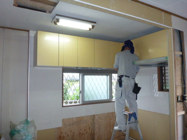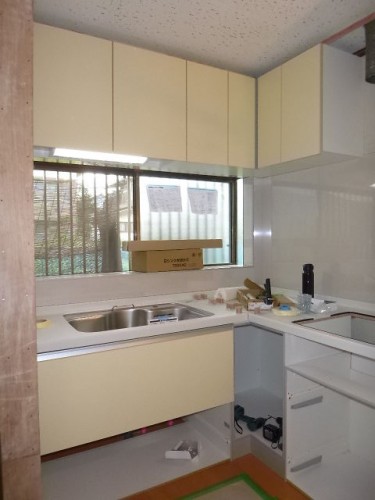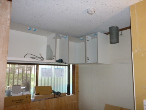 キッチンの設置が完了し、後は細かい仕上げ作業とクロス貼りです。