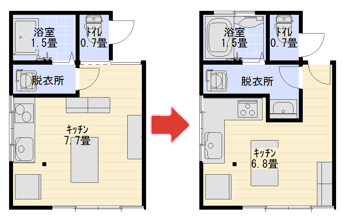 キッチン・吊り戸棚・カウンターの撤去、及び圧迫感のある下がり壁も下がり幅を小さくします。