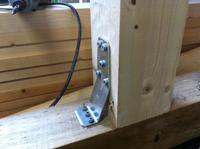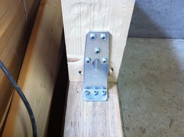 L型の金物は柱が土台から抜けないようにつなげます。主要な柱に取付ます。