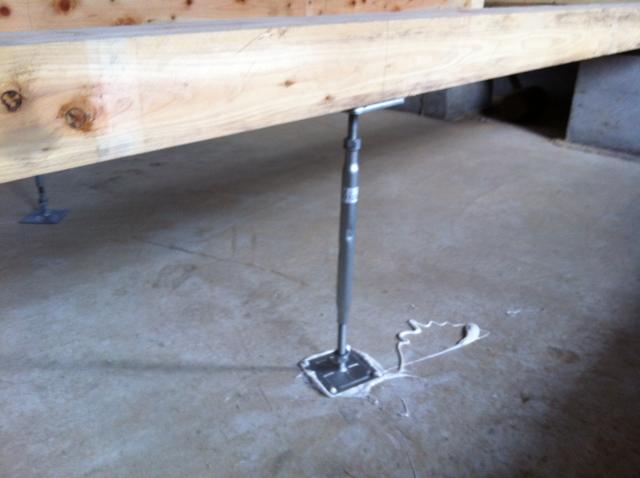 下のへその付いた金物は、土台と既存の基礎をつなげています。