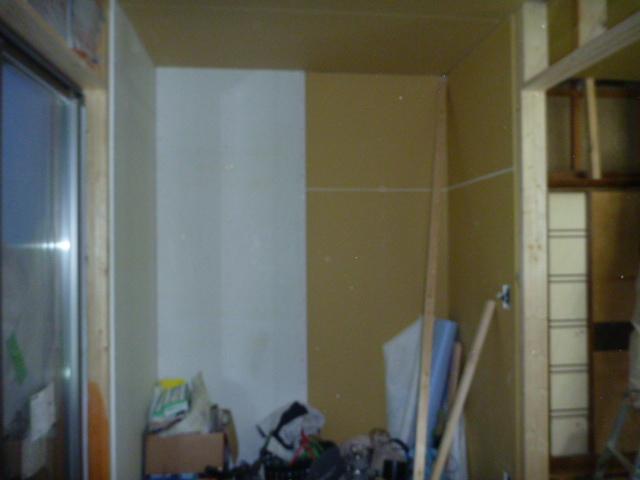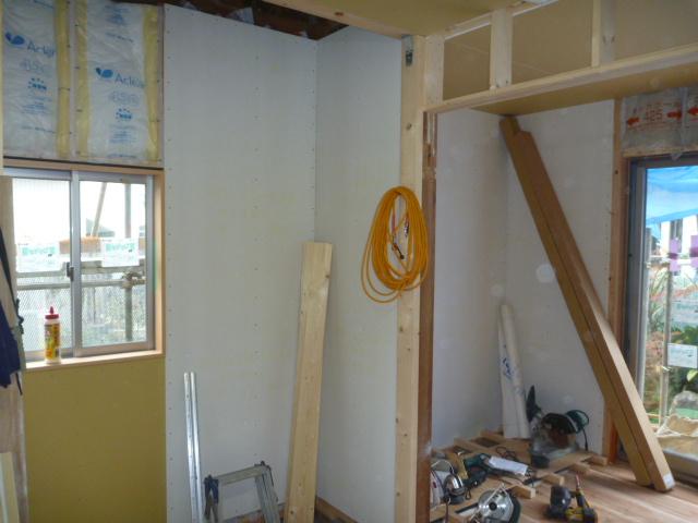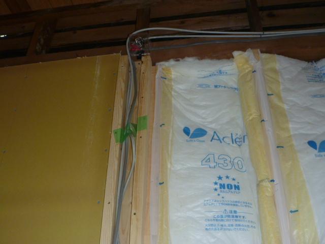 壁も同様に間柱の間に断熱材を敷き詰め、ボードを貼り付けます。