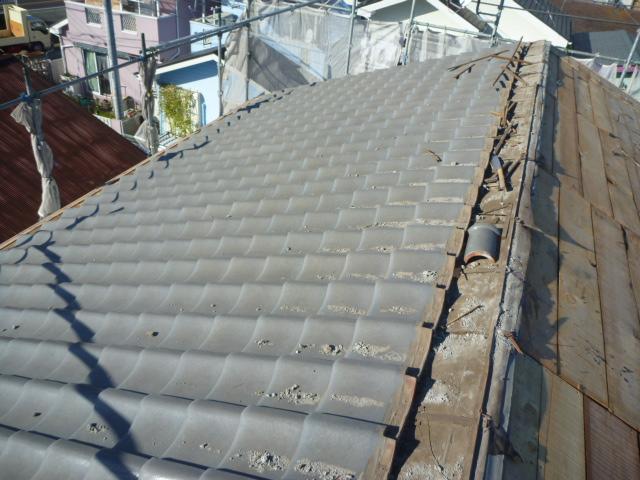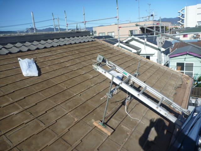 いよいよ瓦をすべて下ろし、太陽光を載せる下準備を行います。