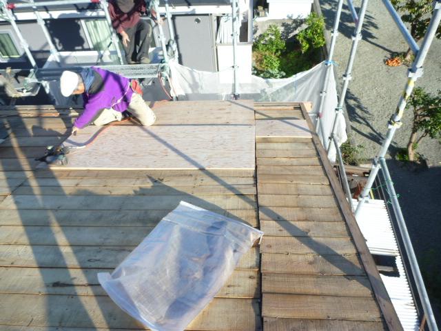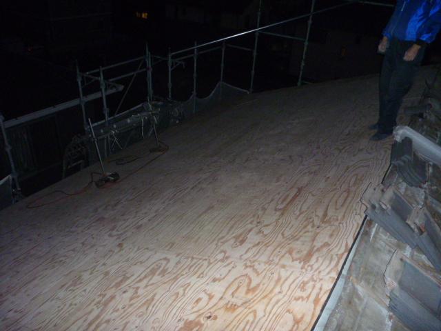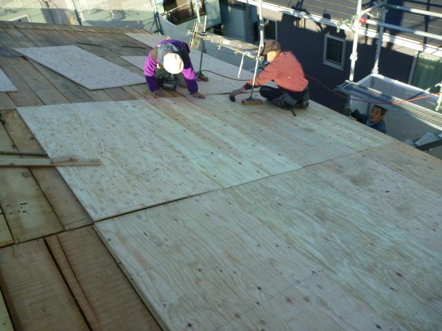 瓦・防水の為のルーフィングをすべて取り除き、野地板を貼りつけて行きます。