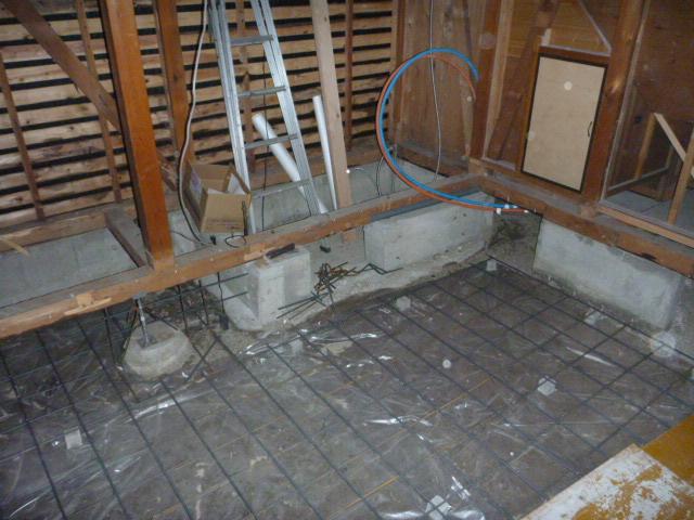 階段下・玄関は湿気対策として、生コンを流します。