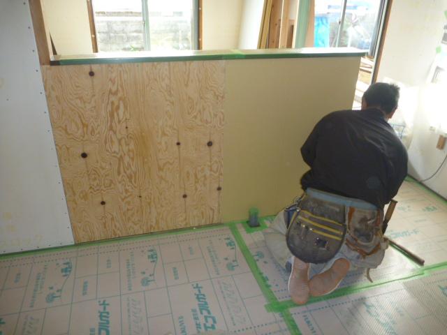 耐力壁もリビング同様に隙間工法を用いて貼りつけていきます。