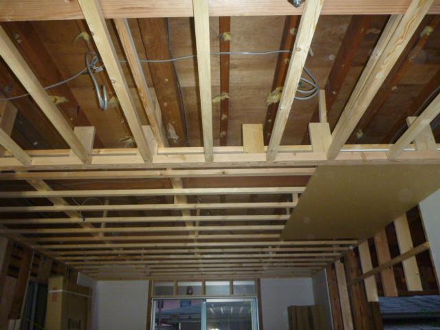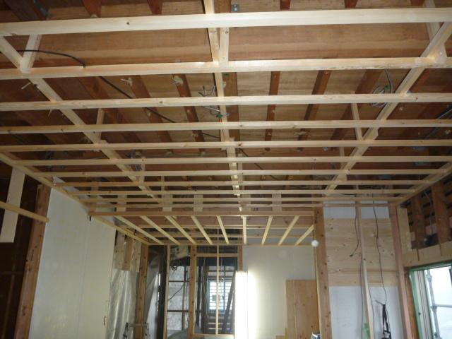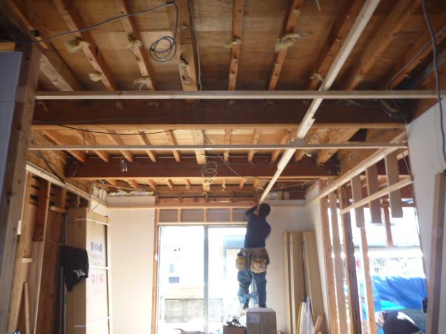 リビングの天井を貼りつける準備として、野縁を付けていきます。