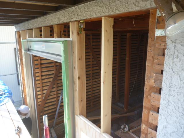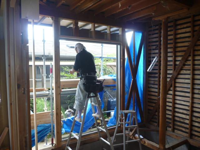 リビングの天井と並行して、和室のサッシ取付をします。