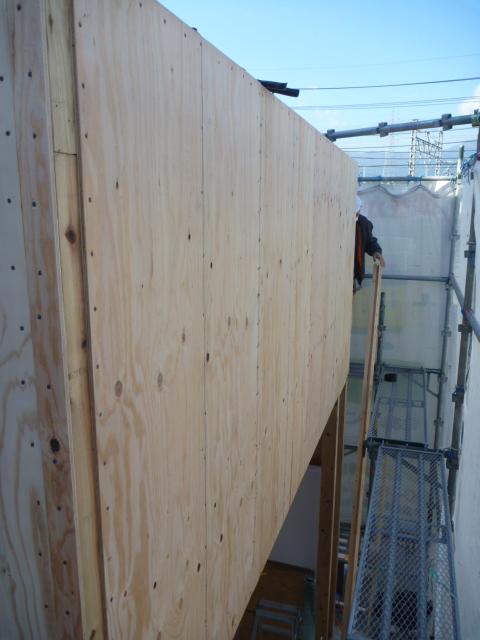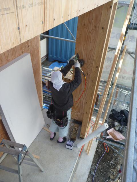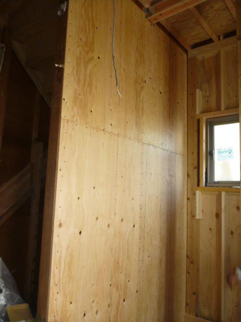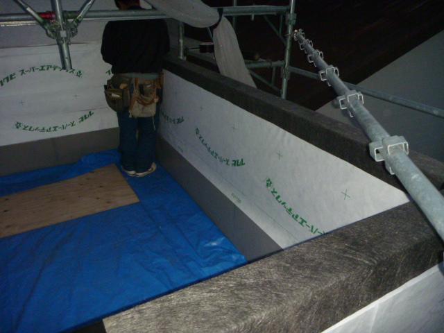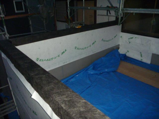 新たに造作した壁に防水シートを貼ります。
