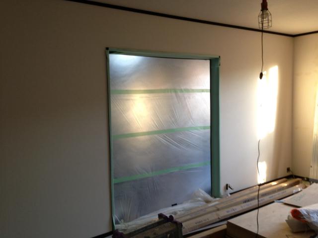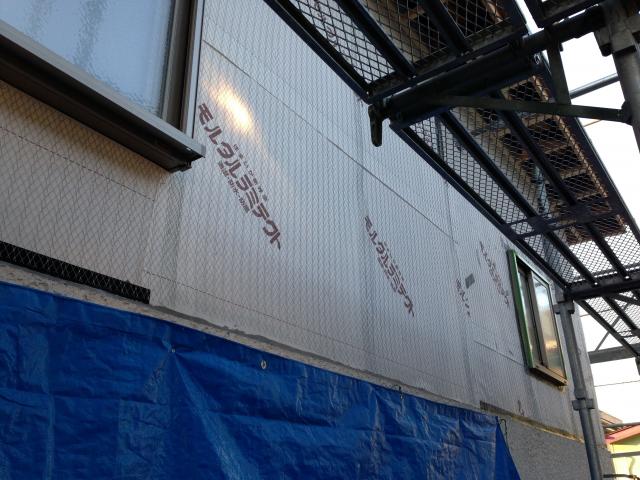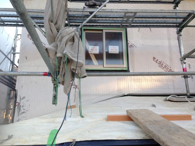左官は、2階のサッシ交換が完了した個所に外壁に網を貼り、下塗準備を行います。