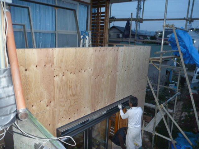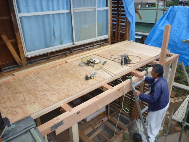 ベランダの床を造っています。構造用合板を2重に貼ります。