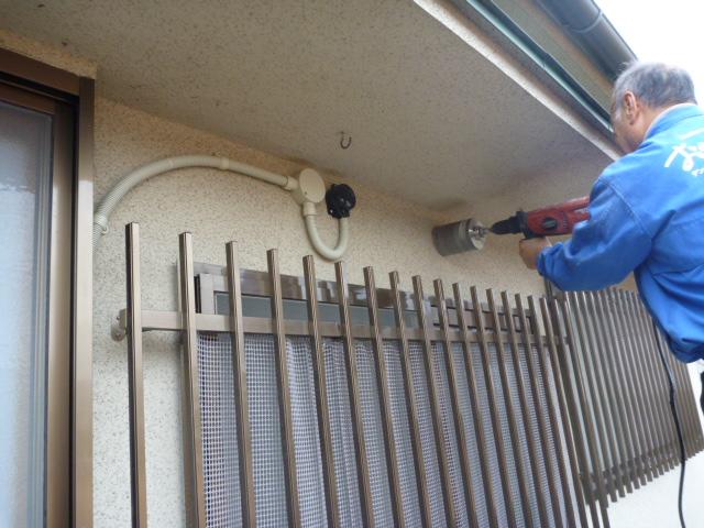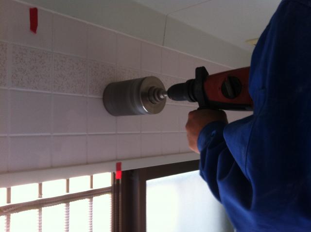 換気口の位置を決め壁に穴をあけていきます。この時、壁には間柱を切断しないよう取付位置を慎重に決めます。