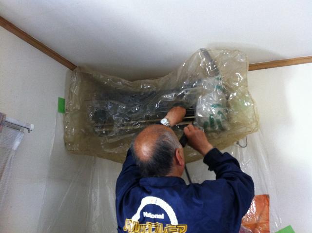 しっかりと養生し前面パネルとフィルターを外したら、熱交換器を専用の機材と薬剤で洗浄していきます。