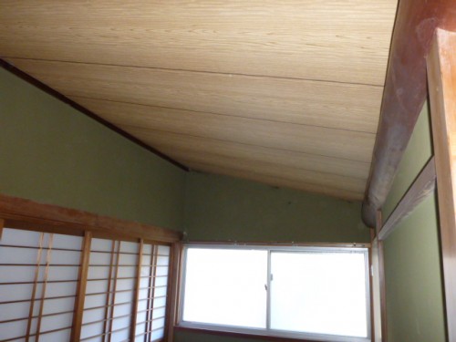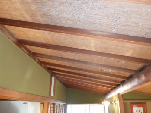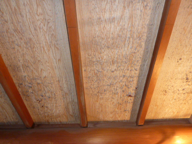 この天井には屋根裏がなく直に屋根の熱が伝わるため、天井の化粧板がはがれおち、
